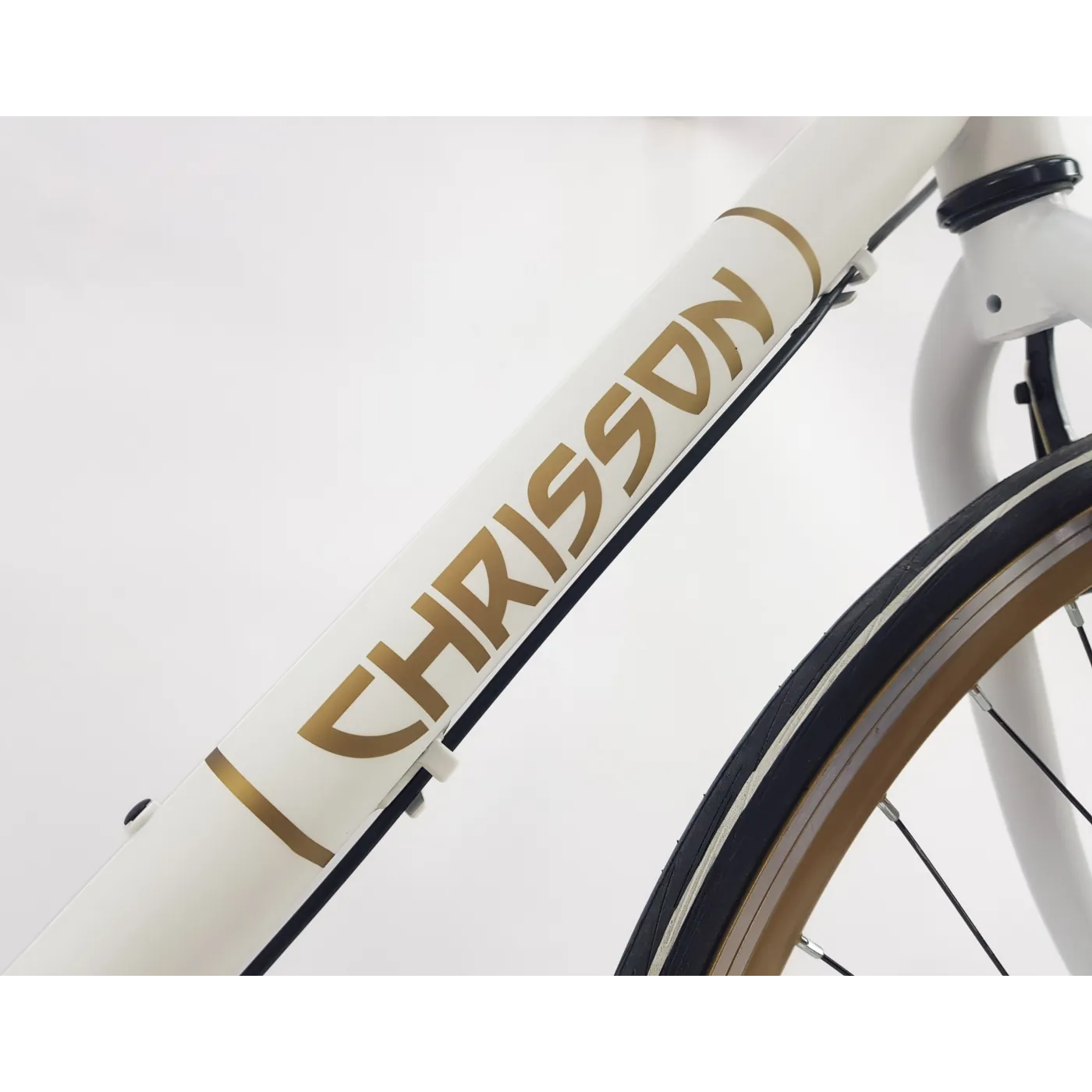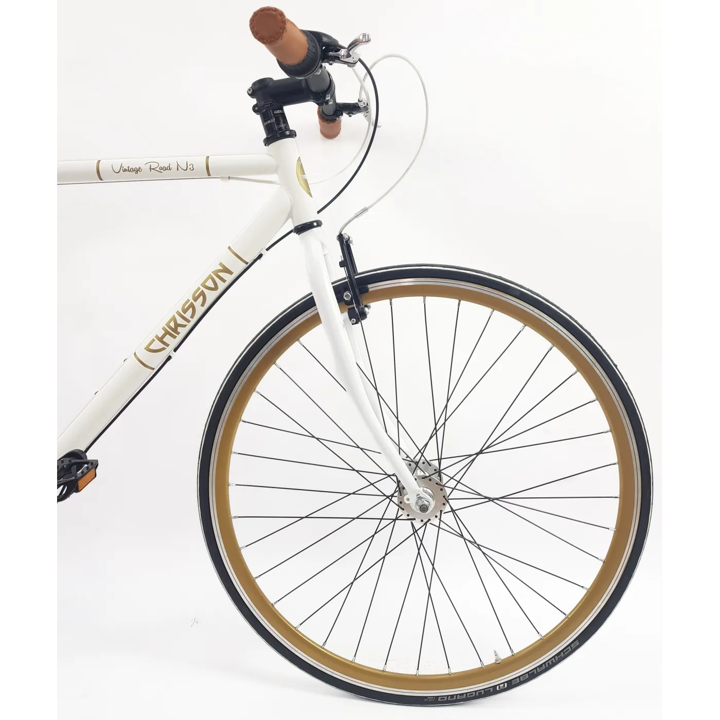 🌟 Uniwersalny rower szosowy Chrisson Vintage Road N3 to doskonały wybór dla osób, które cenią sobie styl i wygodę podczas jazdy. Jego design w białym kolorze z eleganckimi złoto-brązowymi akcentami przyciąga wzrok i sprawia, że wyróżnisz się na drodze.
