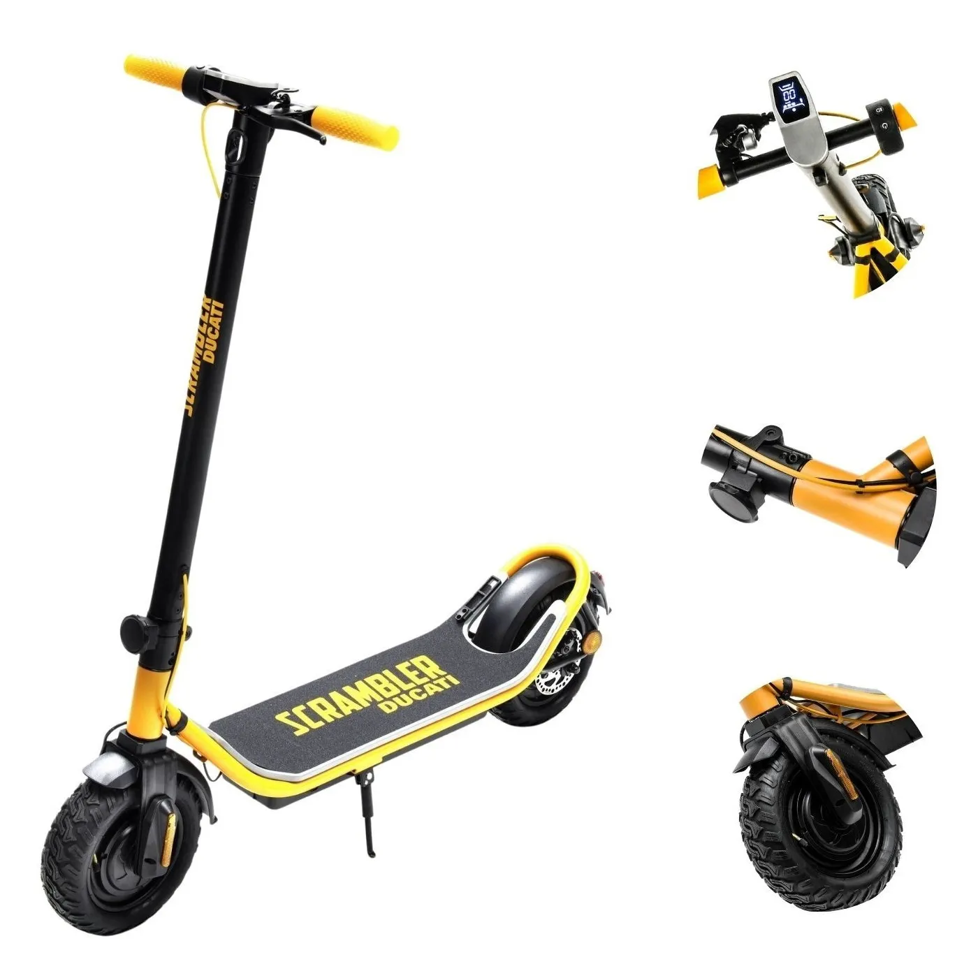 🛴 Hulajnoga elektryczna DUCATI SCRAMBLER CITY CROSS-E X jest wyposażona w 10-calowe koła i tak zwane „grube” opony bezdętkowe, zapobiegające przebiciu. Idealnie sprawdzi się na drogach gruntowych lub bardzo nierównych odcinkach. Silnik zapewnia moc 350 W i gwarantuje prędkość maksymalną na poziomie 20 km/h.