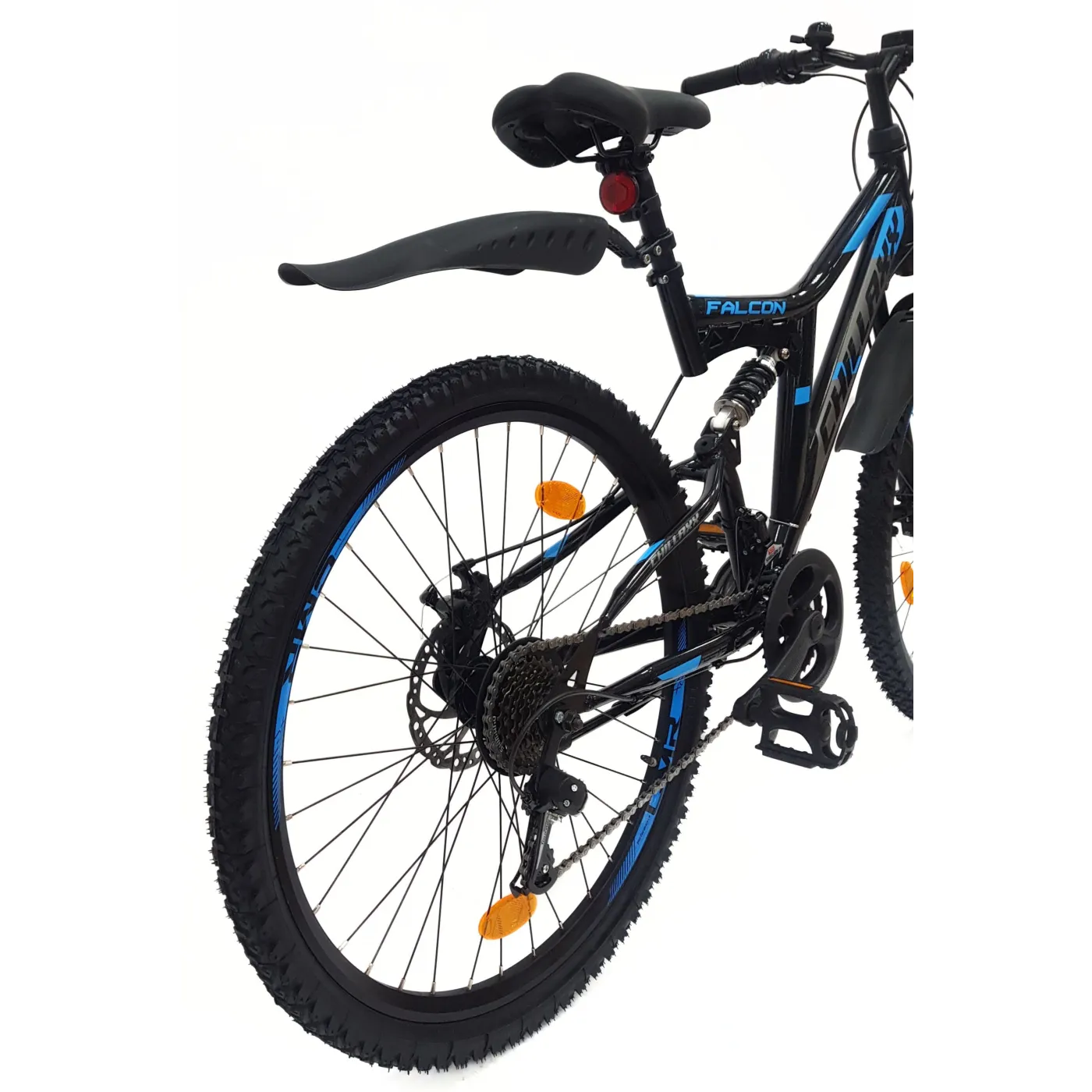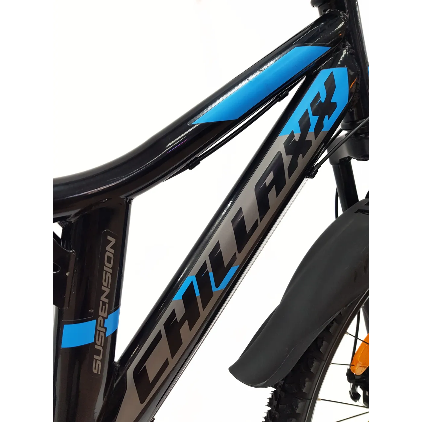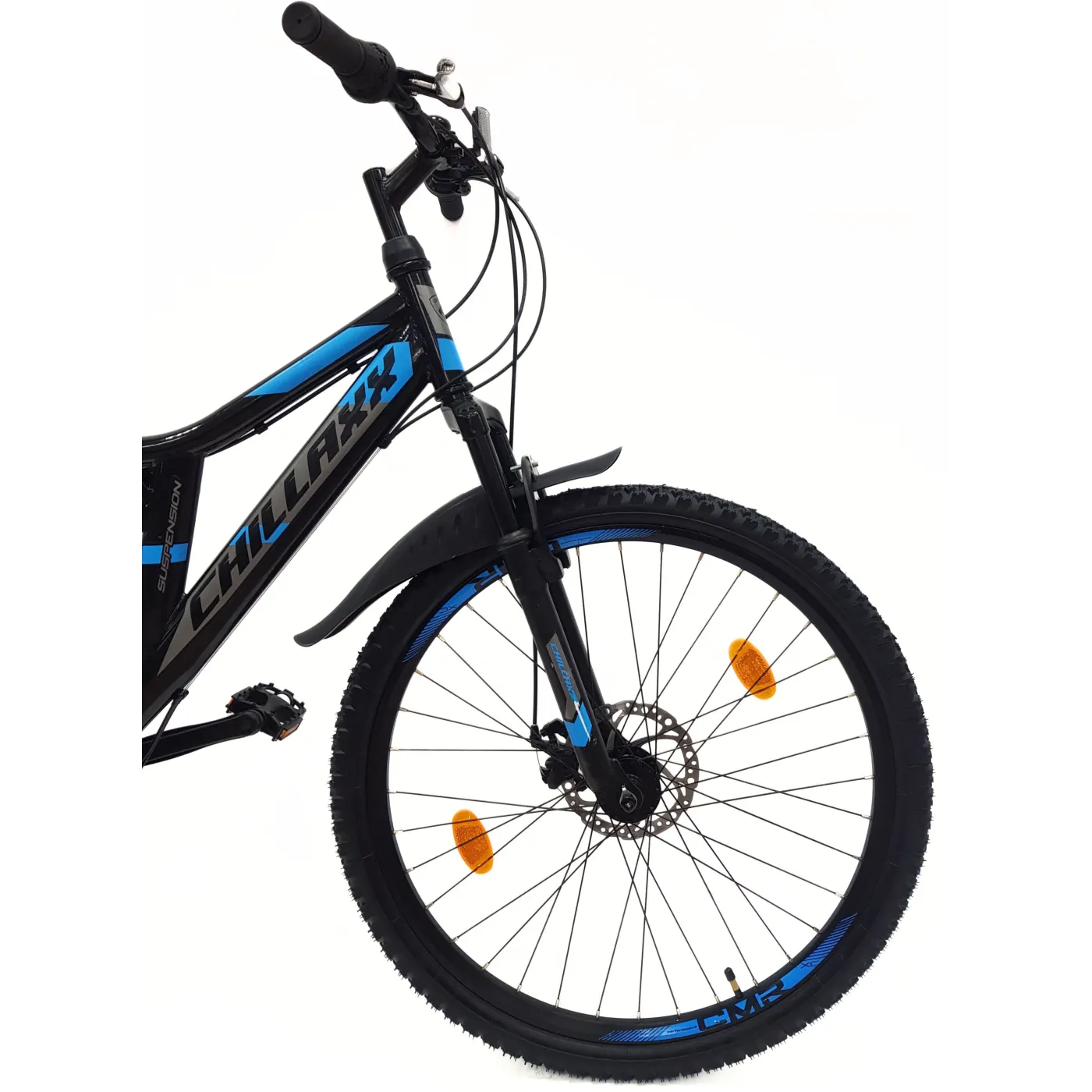✔️ 26-calowy rower górski z pełnym zawieszeniem w kolorze czarnym z niebieskimi detalami, które sprawiają, że rower wyróżnia się spośród innych. Dzięki pełnej amortyzacji ramy, zawsze masz kontrolę nawet na wyboistych drogach. Nie zapomniano również o najważniejszym - bezpiecznym , ale jednocześnie satysfakcjonującym hamowaniu.