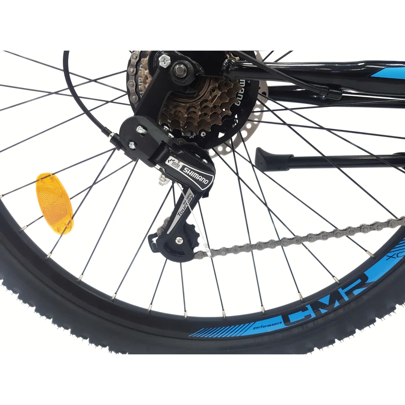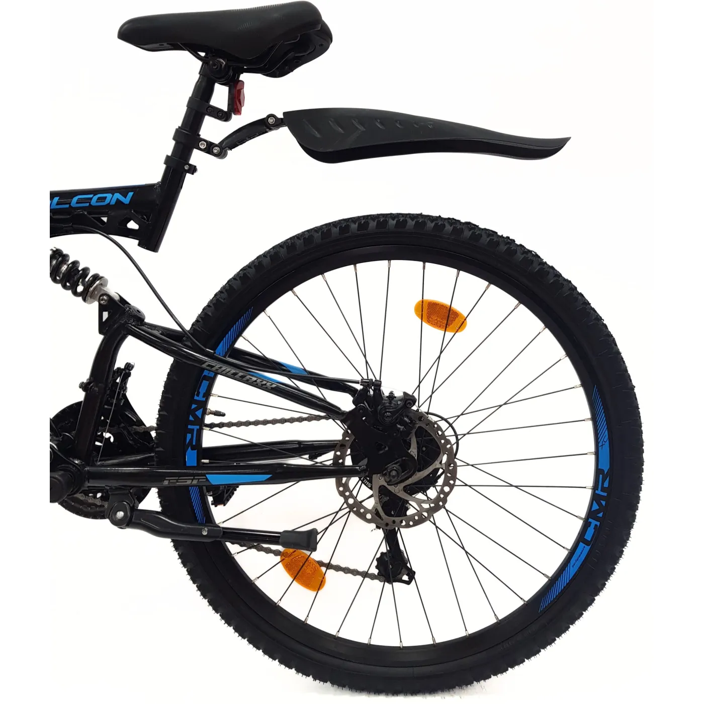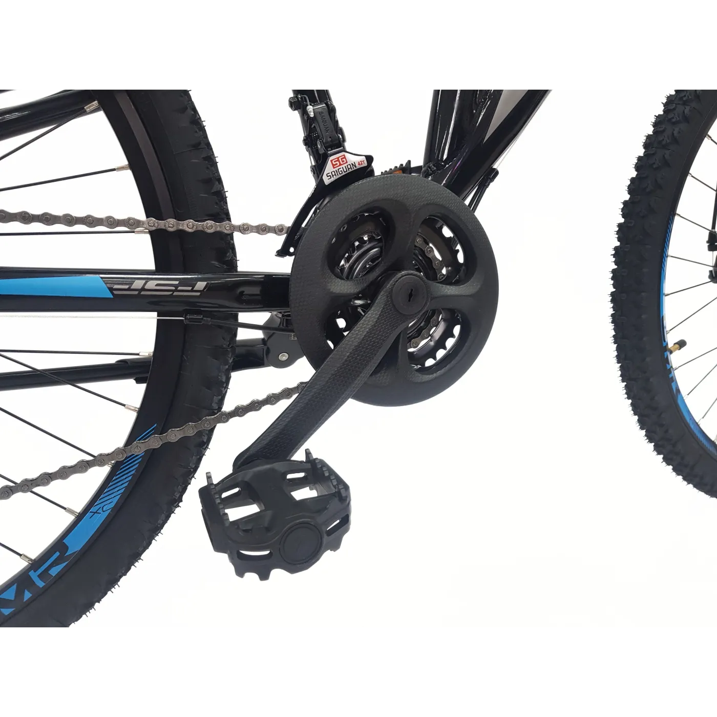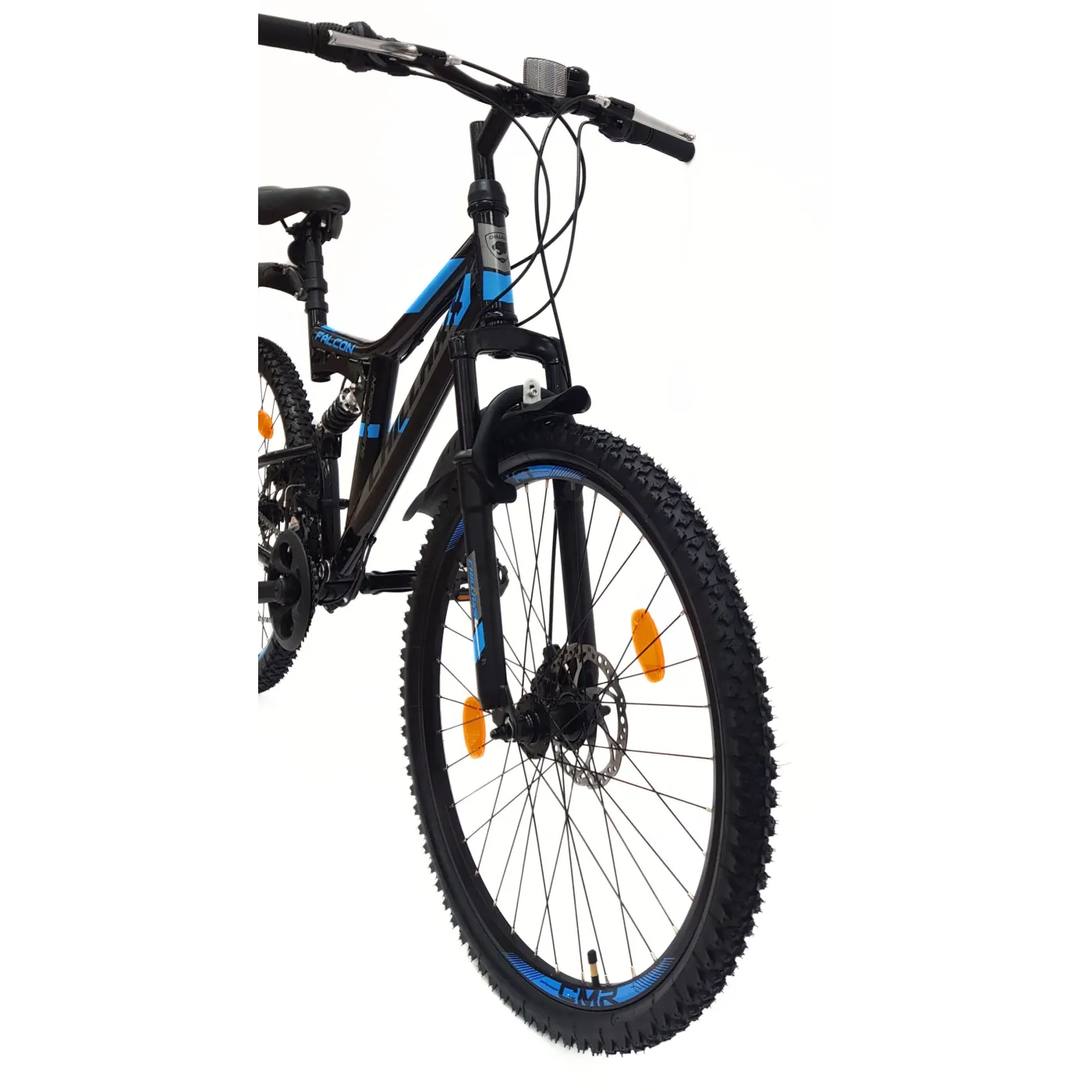 ✔️ 26-calowy rower górski z pełnym zawieszeniem w kolorze czarnym z niebieskimi detalami, które sprawiają, że rower wyróżnia się spośród innych. Dzięki pełnej amortyzacji ramy, zawsze masz kontrolę nawet na wyboistych drogach. Nie zapomniano również o najważniejszym - bezpiecznym , ale jednocześnie satysfakcjonującym hamowaniu.