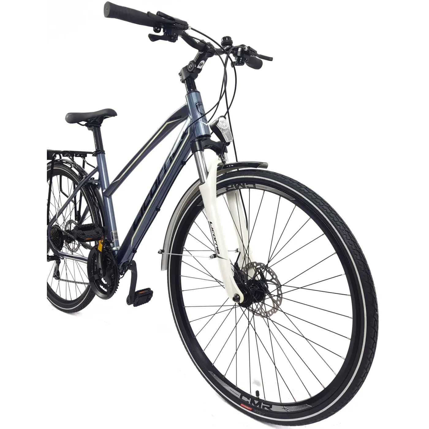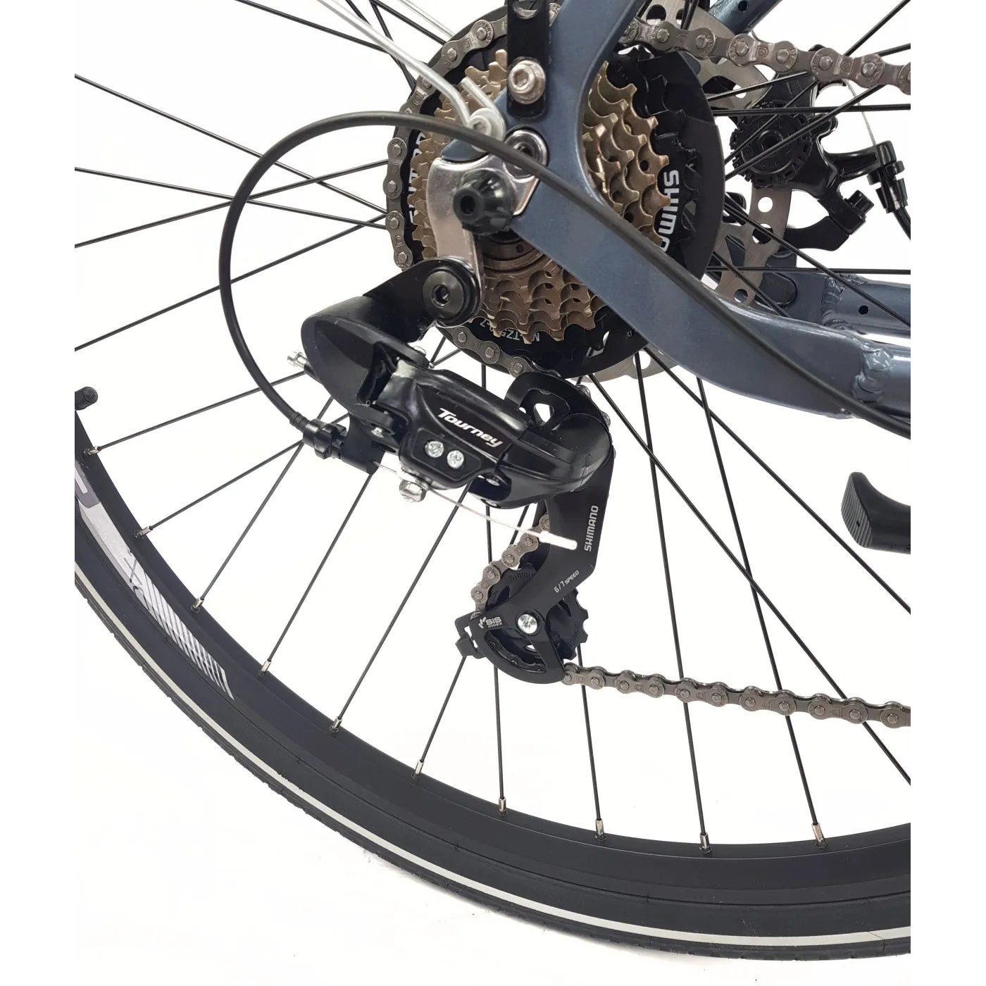 👉 21-biegowa przerzutka Shimano oraz manetki cynglowe, zapewniają płynną zmianę przełożeń, co ułatwia pokonywanie różnorodnych tras. Opony w rozmiarze 700 x 38C zapewniają dobrą przyczepność i stabilność roweru na różnych rodzajach nawierzchni, a amortyzowany widelec minimalizuje wstrząsy podczas jazdy po nierównym terenie.