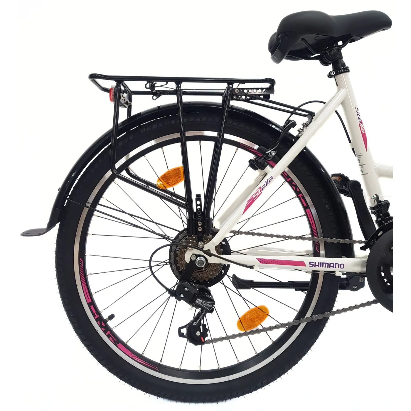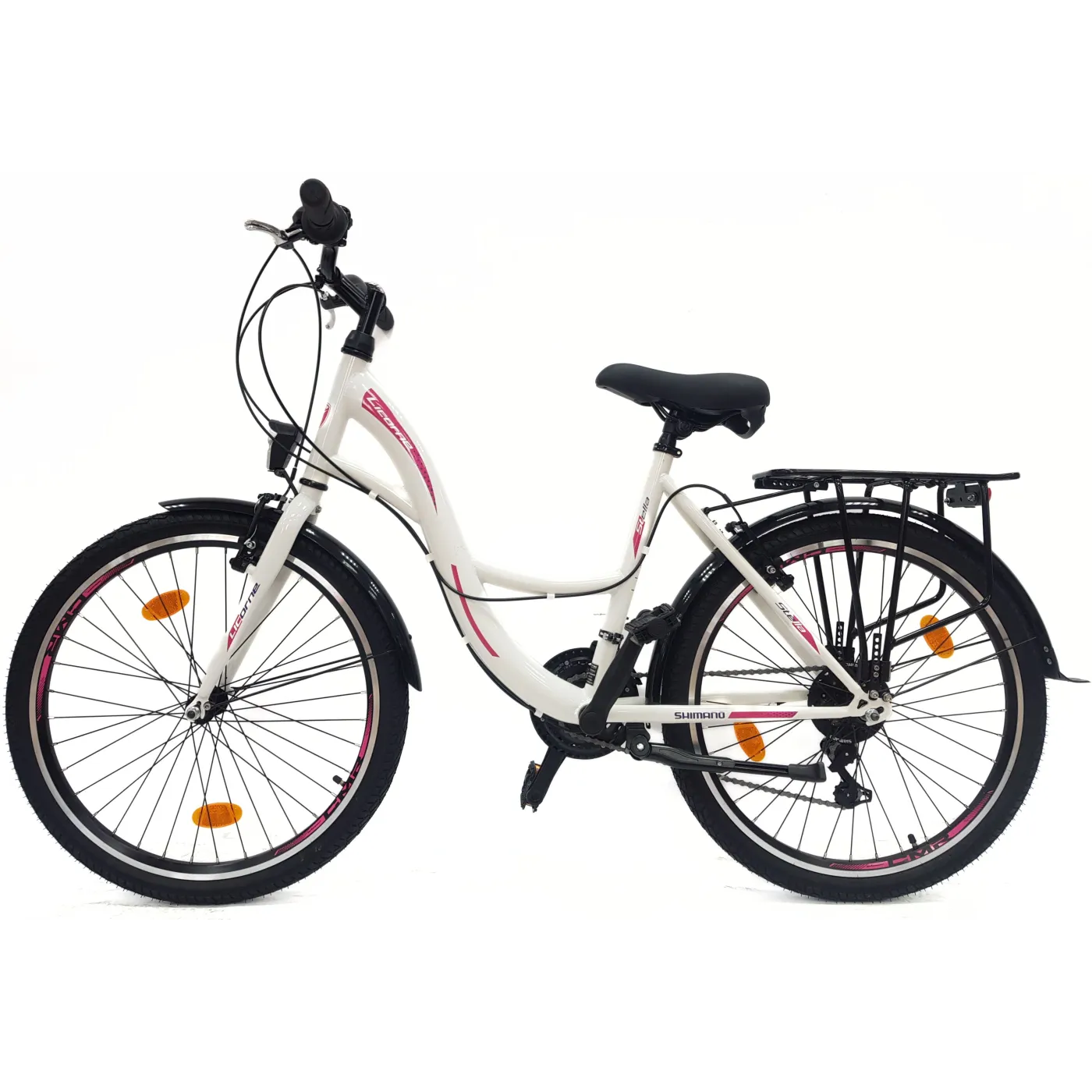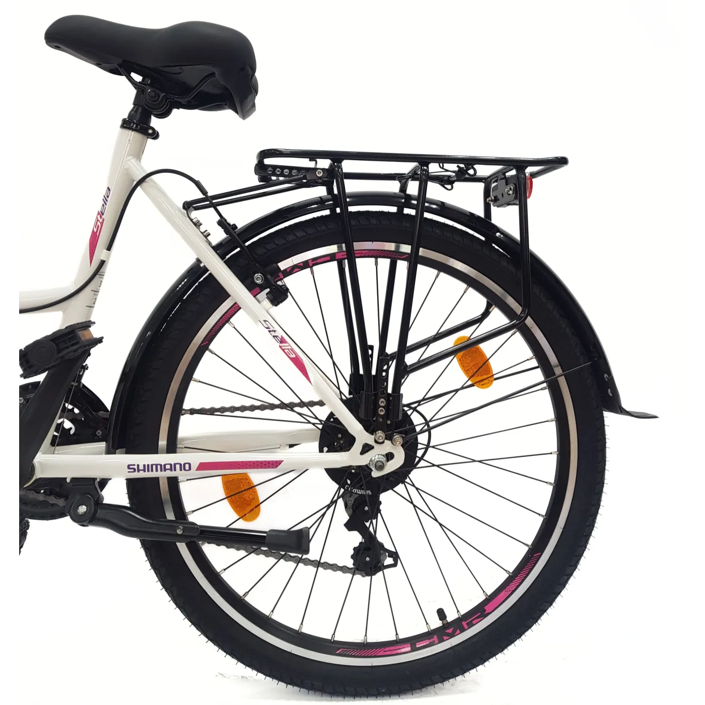 👌 Opony w rozmiarze 24" x 1,75" zapewniają komfortową jazdę zarówno po asfalcie, jak i drogach szutrowych. Dodatkowo, model ten wyposażony jest w odblaski, które zwiększają widoczność rowerzysty, co wpływa bezpośrednio na bezpieczeństwo jazdy. Bagażnik umożliwia przewożenie drobnych rzeczy, a światła zapewniają doskonałą widoczność w warunkach nocnych.