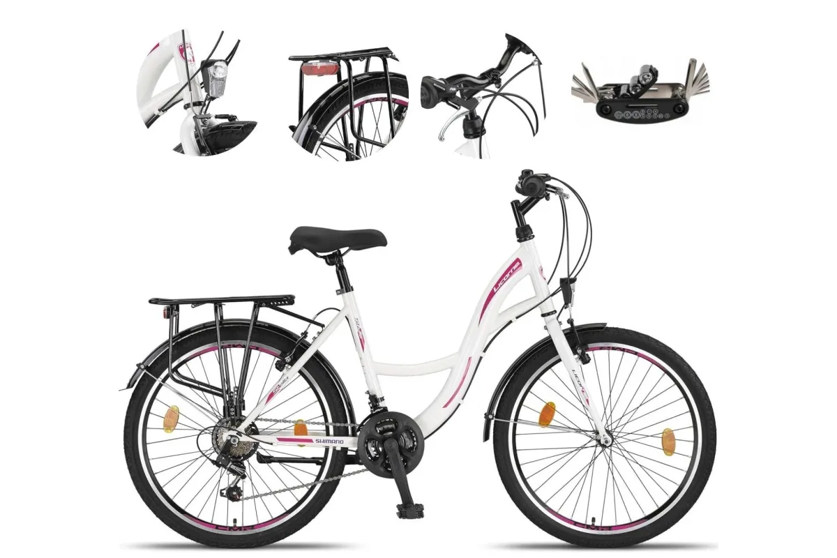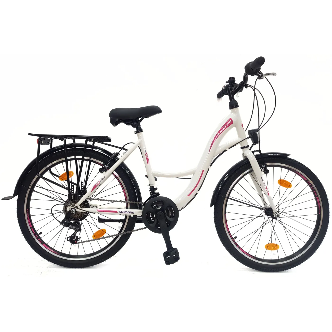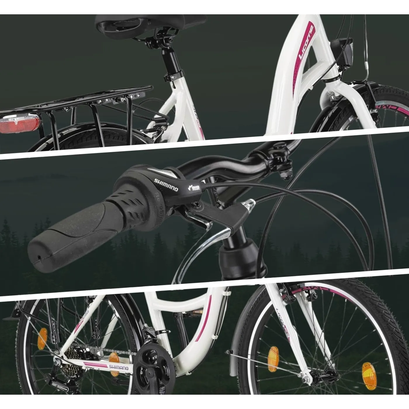 👌 Opony w rozmiarze 24" x 1,75" zapewniają komfortową jazdę zarówno po asfalcie, jak i drogach szutrowych. Dodatkowo, model ten wyposażony jest w odblaski, które zwiększają widoczność rowerzysty, co wpływa bezpośrednio na bezpieczeństwo jazdy. Bagażnik umożliwia przewożenie drobnych rzeczy, a światła zapewniają doskonałą widoczność w warunkach nocnych.