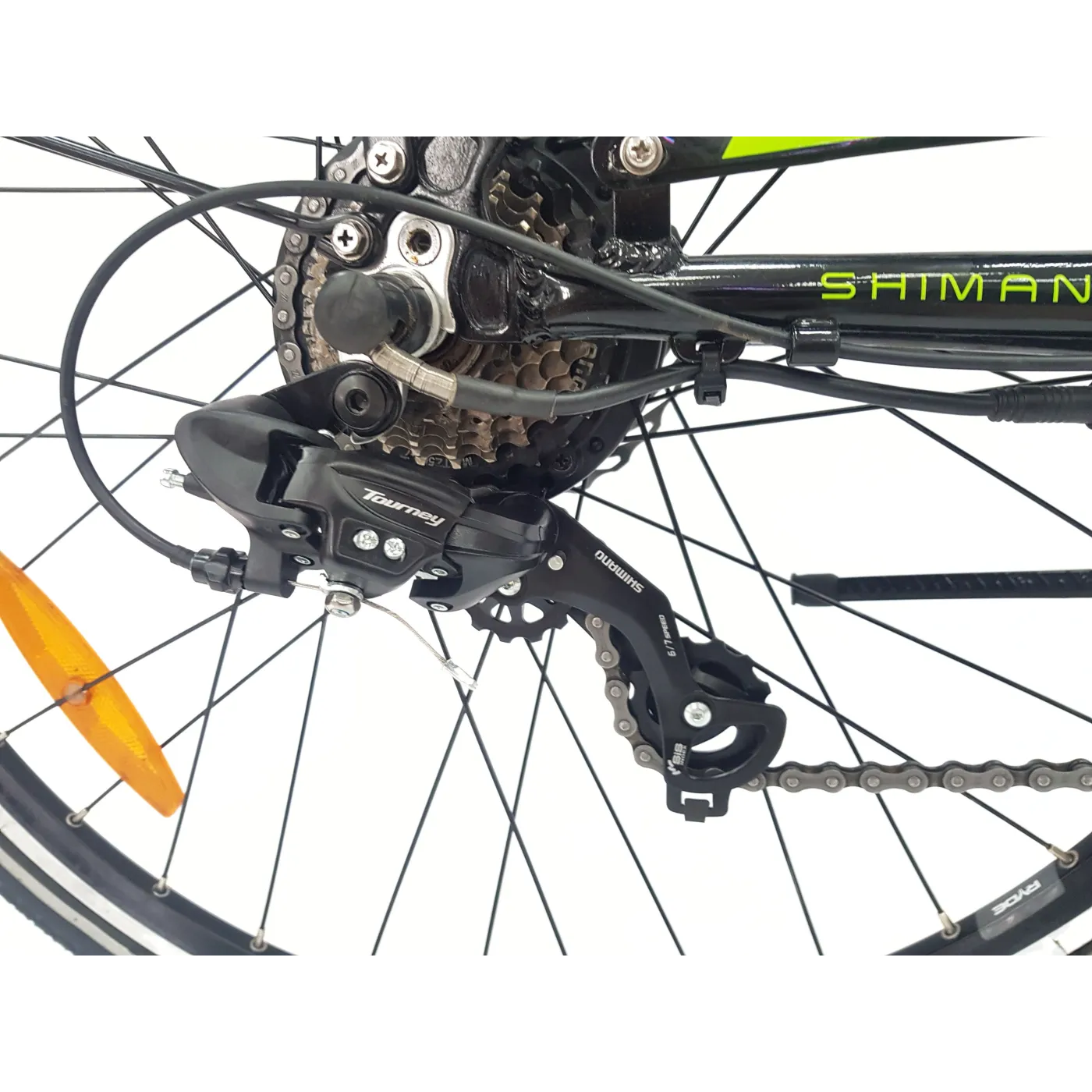 👉 Rower wyposażony został w skuteczne hamulce tarczowe, które zapewniają szybką i bezpieczną hamulcowość, co jest istotne w gęstym ruchu miejskim. 7-biegowa przerzutka Shimano Tourney oraz manetka obrotowa Revoshift umożliwiają płynną zmianę biegów, co sprawia że jazda jest komfortowa i dostosowana do warunków drogowych.