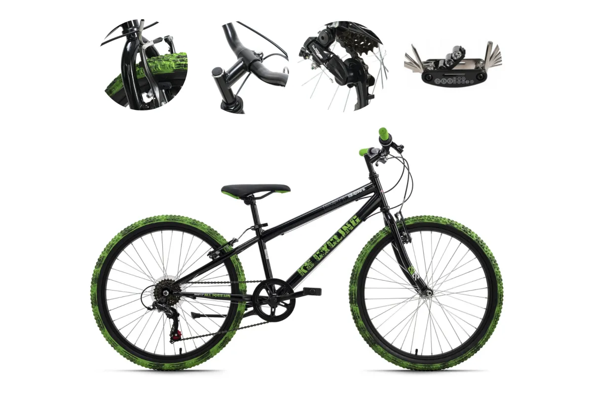 🚲 KS Cycling Crusher to wyjątkowy rower dziecięcy, który łączy w sobie nowoczesny design i funkcjonalność. Jego czarno-zielona rama z naklejkami nadaje mu dynamiczny i stylowy wygląd, który z pewnością przyciągnie uwagę.