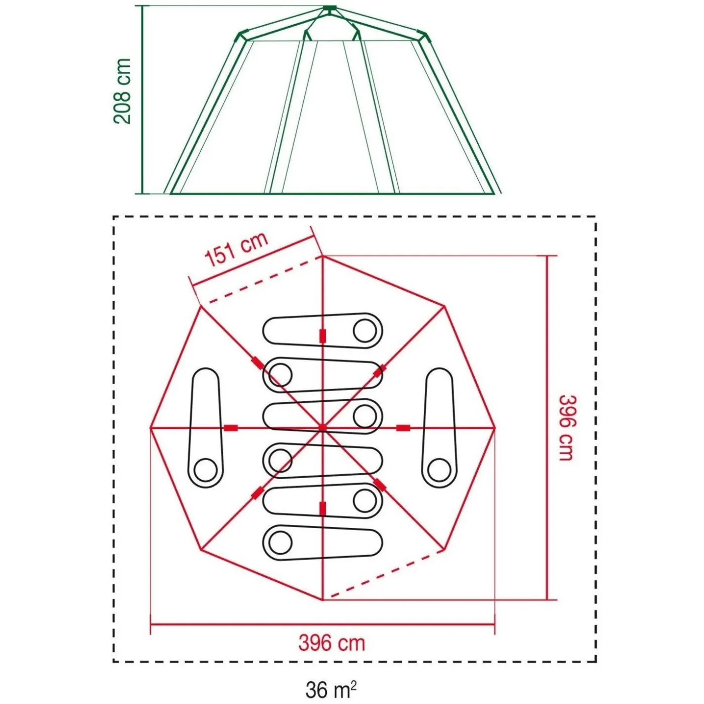 Jednym z najważniejszych atutów jest jego niespotykana wielkość. Z wymiarami 396 x 396 x 208 cm, stanowi on jeden z największych namiotów w swoim segmencie. Liczne okna umieszczone na wszystkich ściankach oferują panoramiczny widok oraz doskonałą wentylację, co wpływa na przyjemność korzystania, nawet w upalne dni.