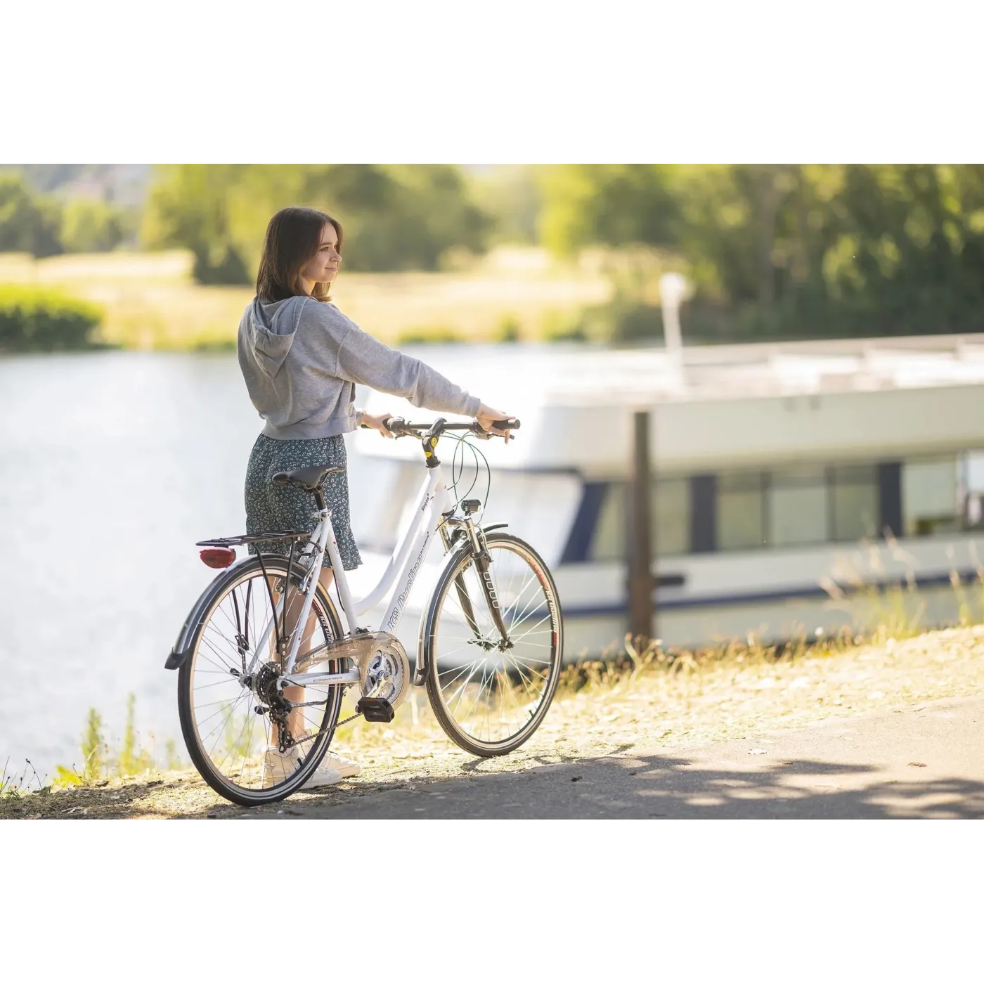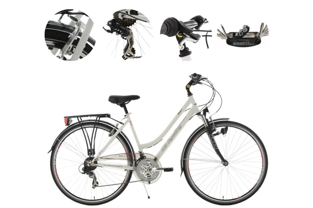 👌 Koła o średnicy 28" oraz opony 700 x 35c zapewniają stabilność i pewność jazdy nawet po nierównym terenie. Amortyzowany widelec pozwala zwiększyć komfort podróżowania, absorbując wstrząsy i nierówności terenu.
