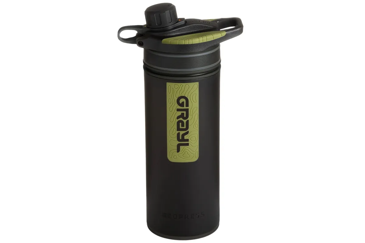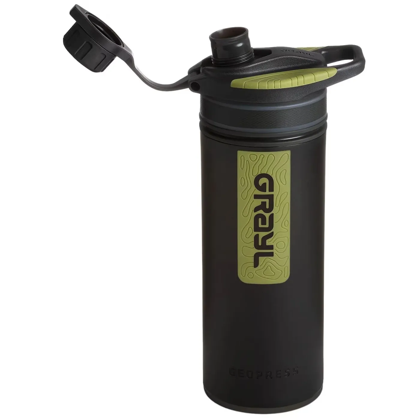 Grayl GeoPress składa się z 4 elementów: wytrzymałego pojemnika zewnętrznego, filtra węglowego, pojemnika na czystą wodę oraz pokrywki z ustnikiem do picia i odpowietrzania. Aby ułatwić proces wciskania filtra, boki pokrywy są szersze i pokryte antypoślizgową gumą. Pojemność butelki wynosi 710 ml.