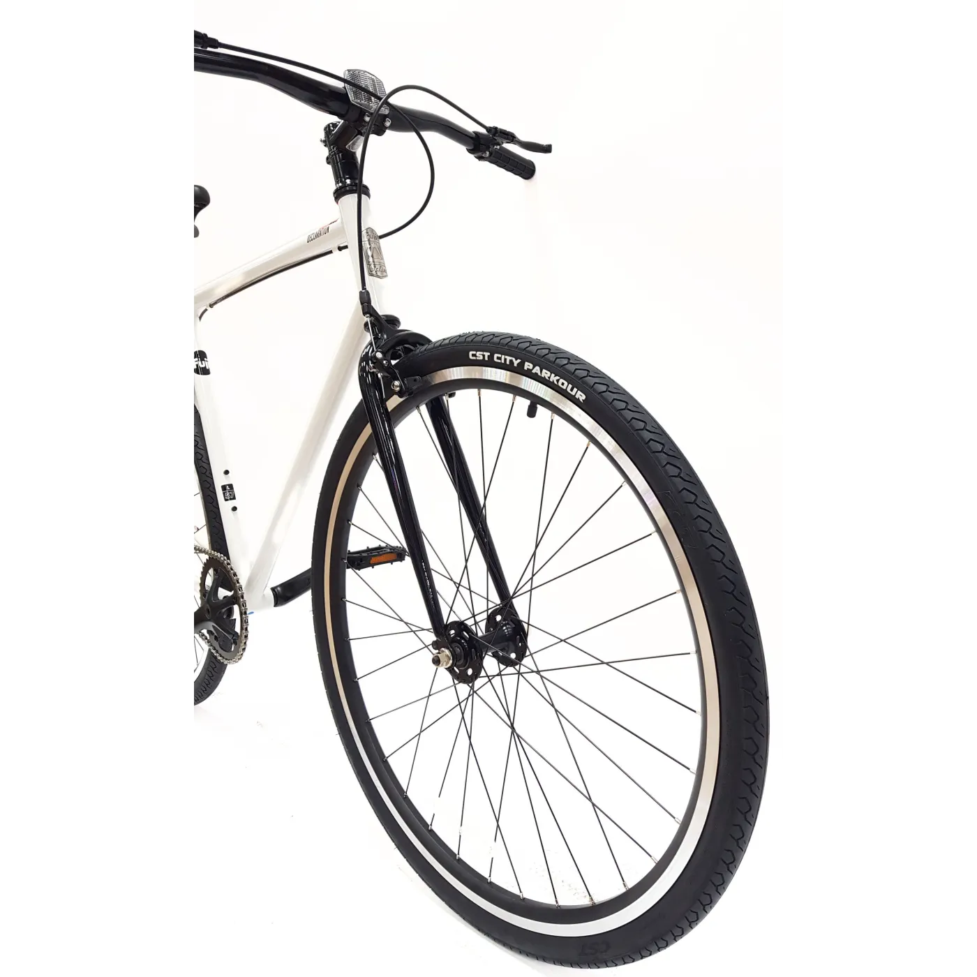 👌 Biały kolor w połysku nadaje rowerowi elegancki i nowoczesny wygląd, co sprawia, że z pewnością wyróżni się na ulicy. Odblaski umieszczone na kierownicy, sztycy oraz kołach zapewniają dodatkową widoczność rowerzysty podczas jazdy w warunkach ograniczonej widoczności, co jest niezwykle istotne dla bezpieczeństwa na drodze.