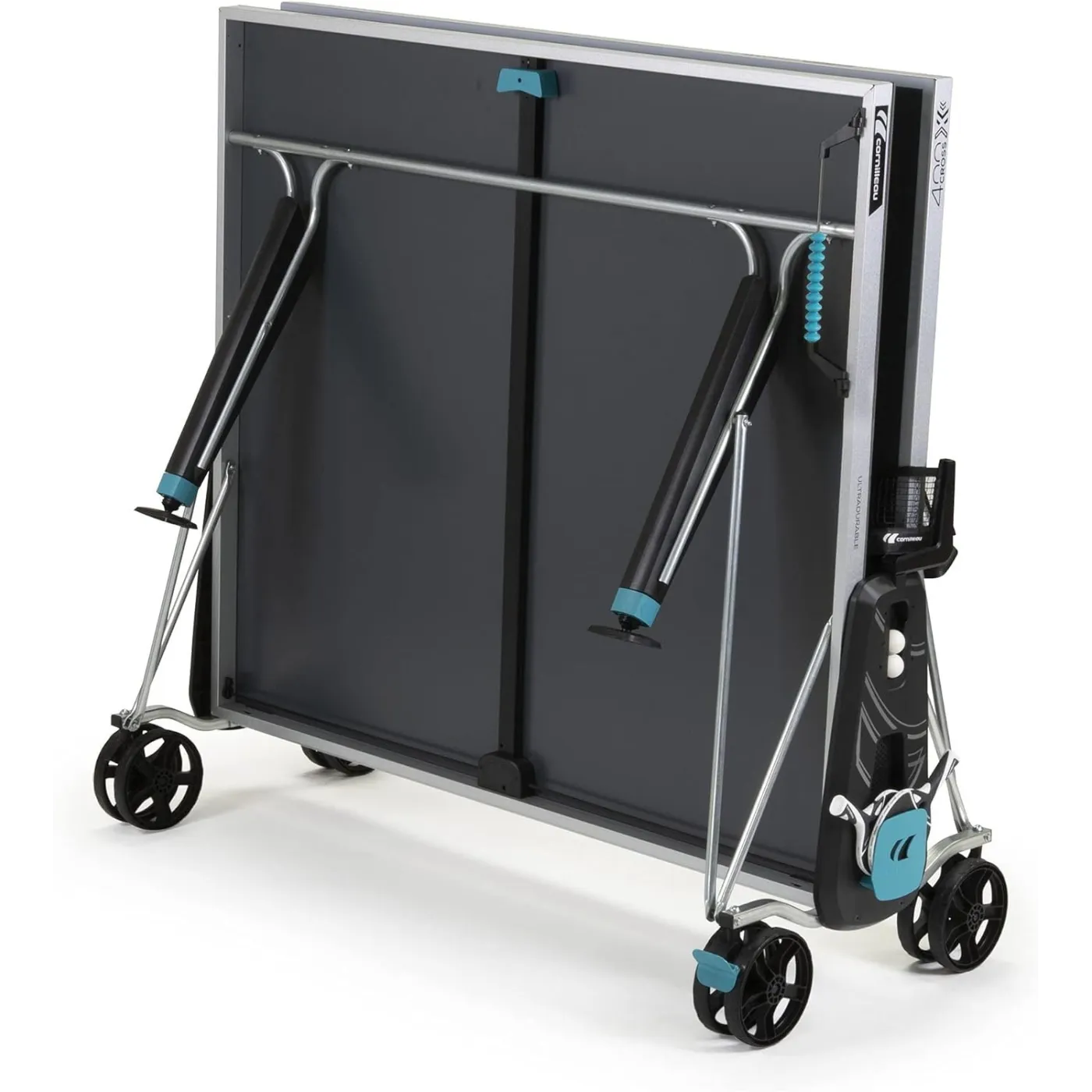- Duże koła z hamulcami: Stoły Cornilleau posiadają duże podwójne koła o grubości 32 mm i średnicy 200 mm. Takie rozwiązanie zwiększa toczenie kół oraz stabilność stołu. Większe koło z łatwością wtoczy się przez duże przeszkody takie jak schody, progi kamienie