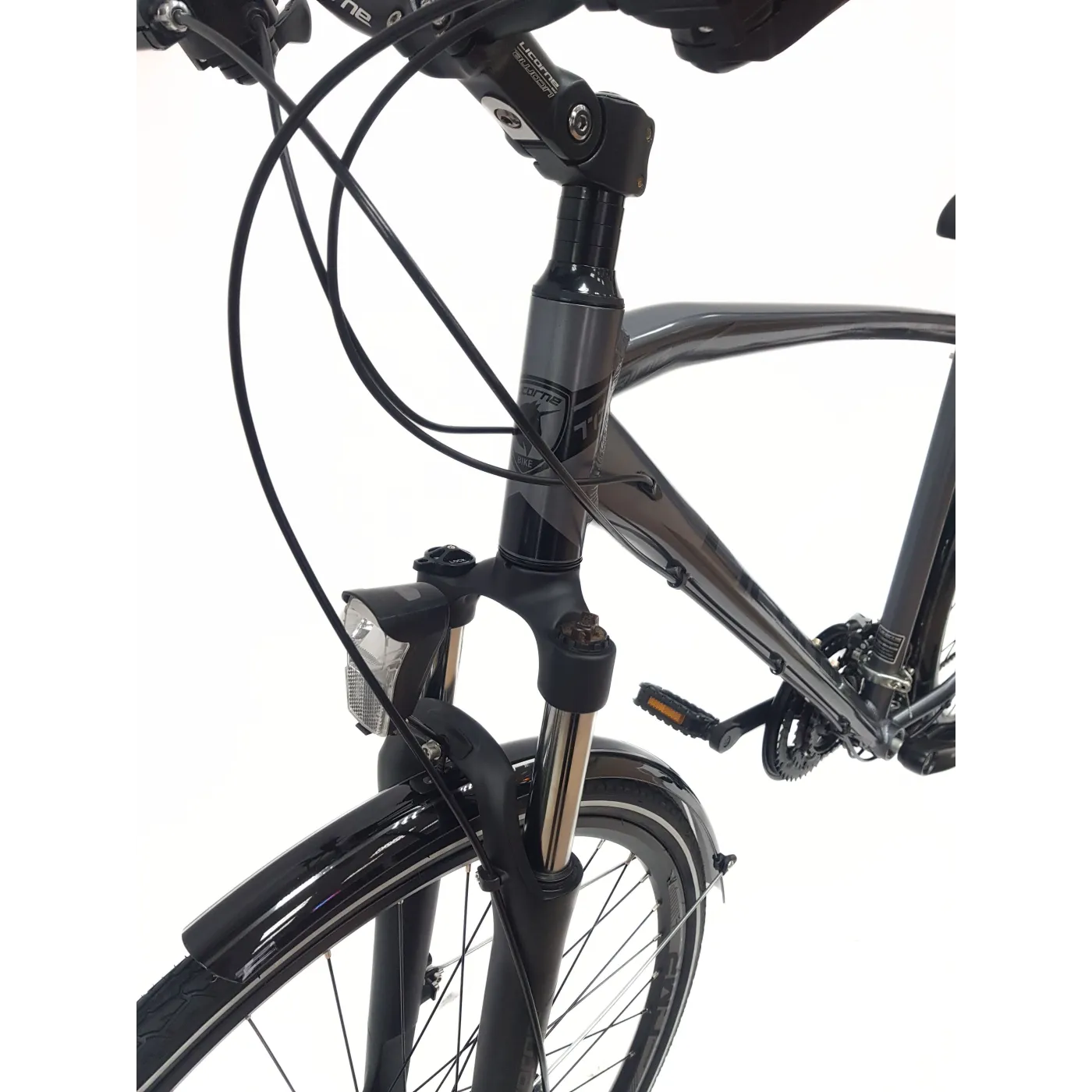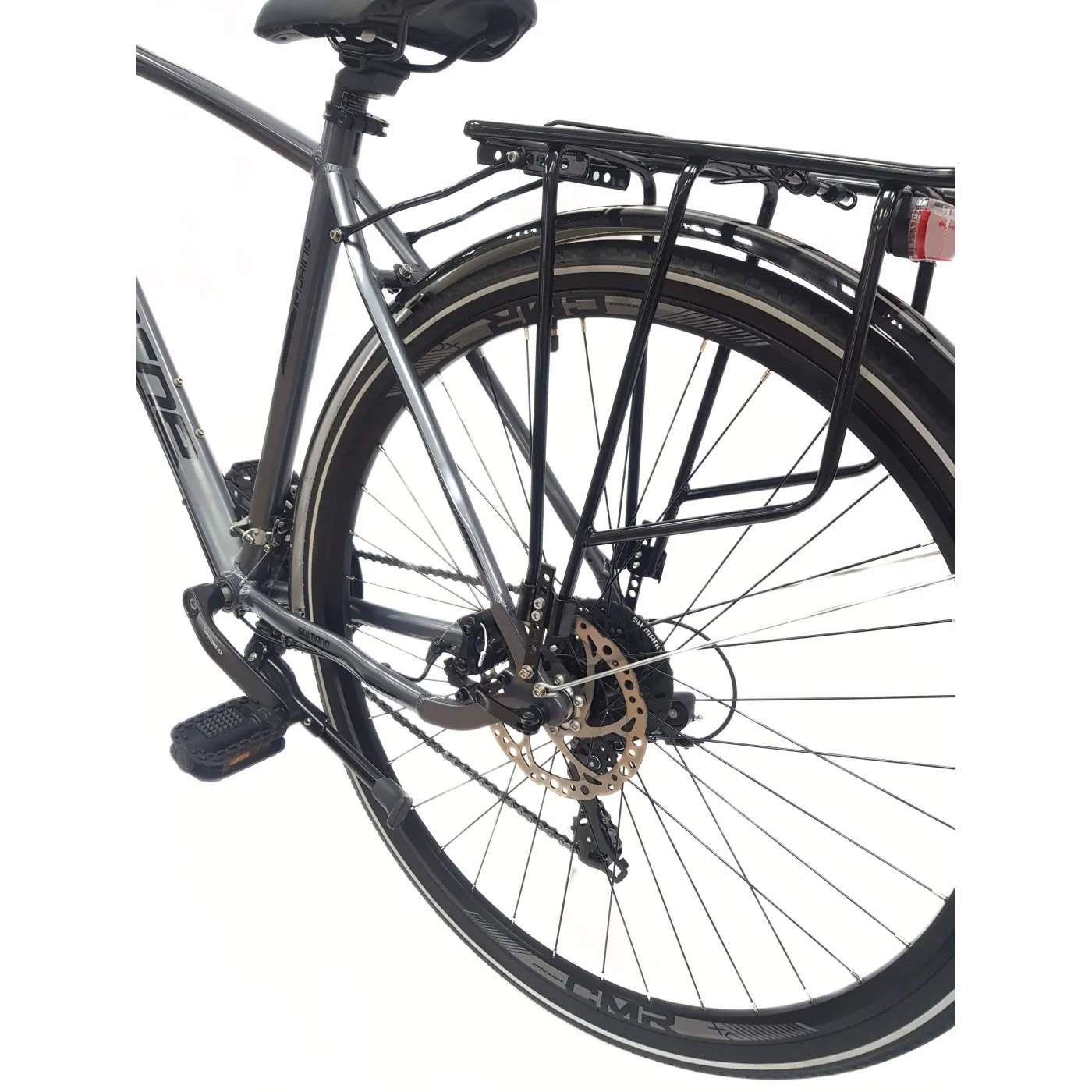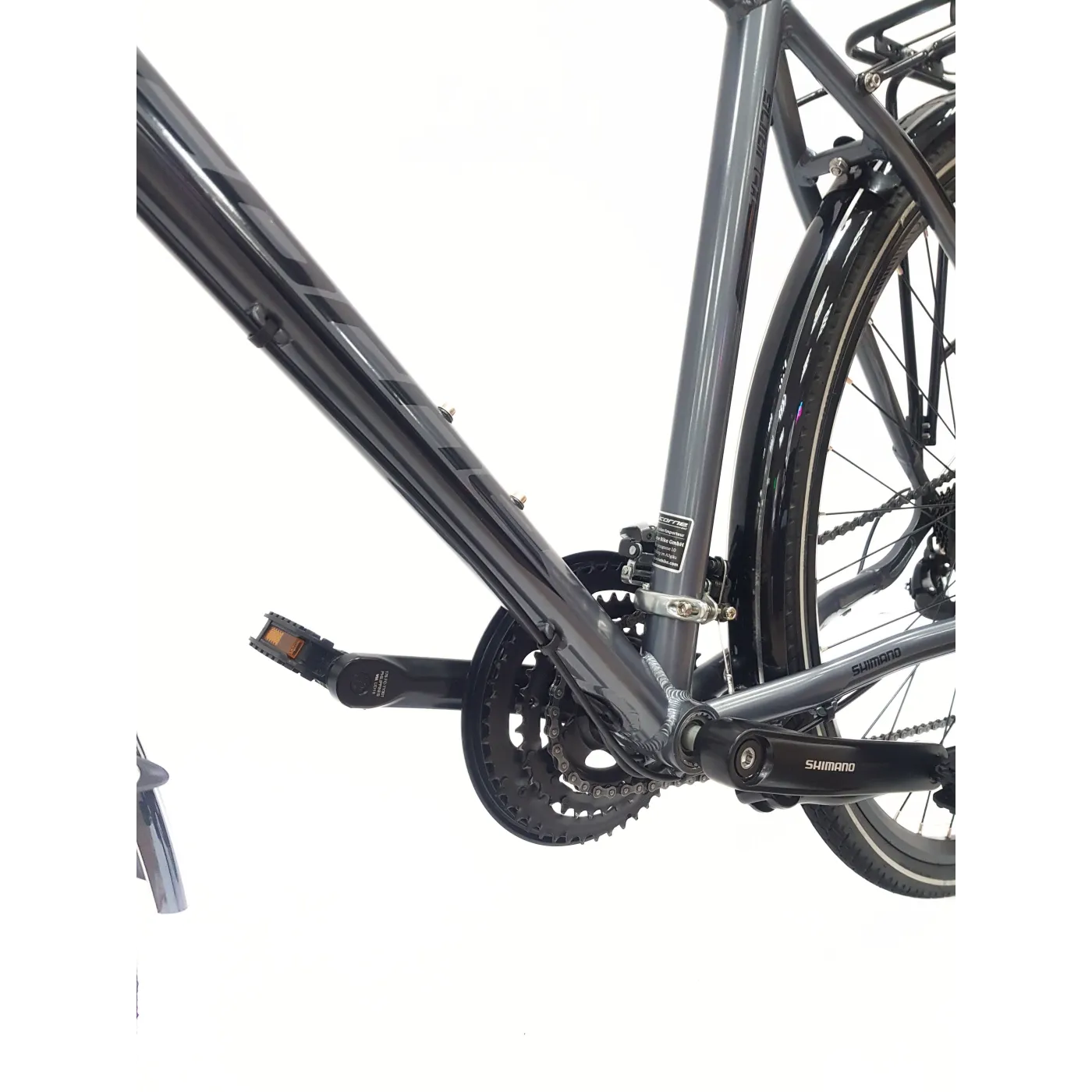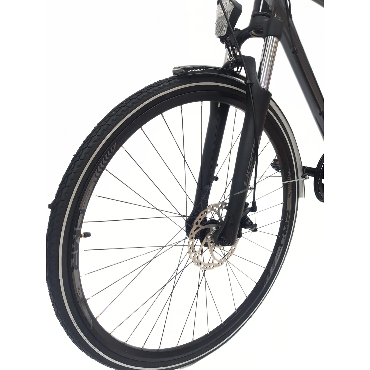 👉 Opony o rozmiarze 28" x 1,90" gwarantują stabilność i komfort jazdy zarówno po asfalcie, jak i po lekko zniszczonych nawierzchniach. Kolorystyka roweru w czerni z szarymi wstawkami nadaje mu eleganckiego i nowoczesnego wyglądu, który z pewnością przyciąga spojrzenia.