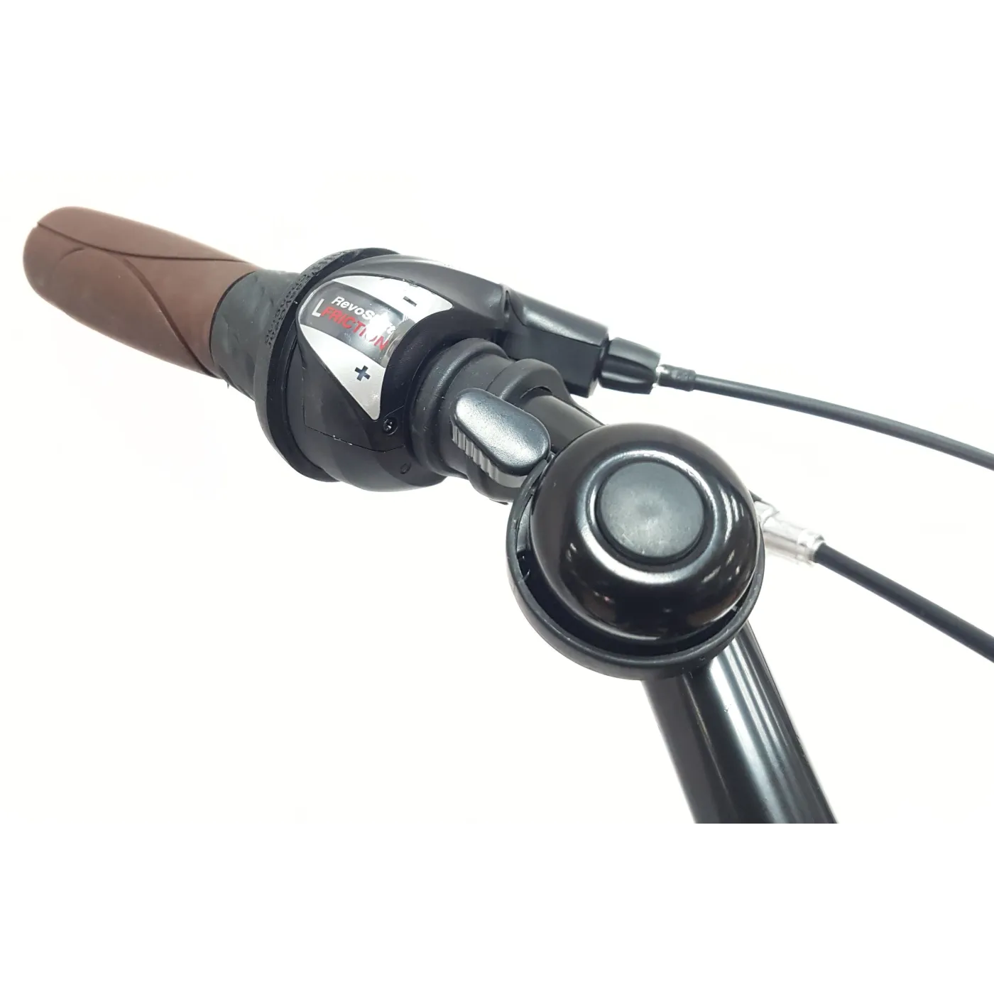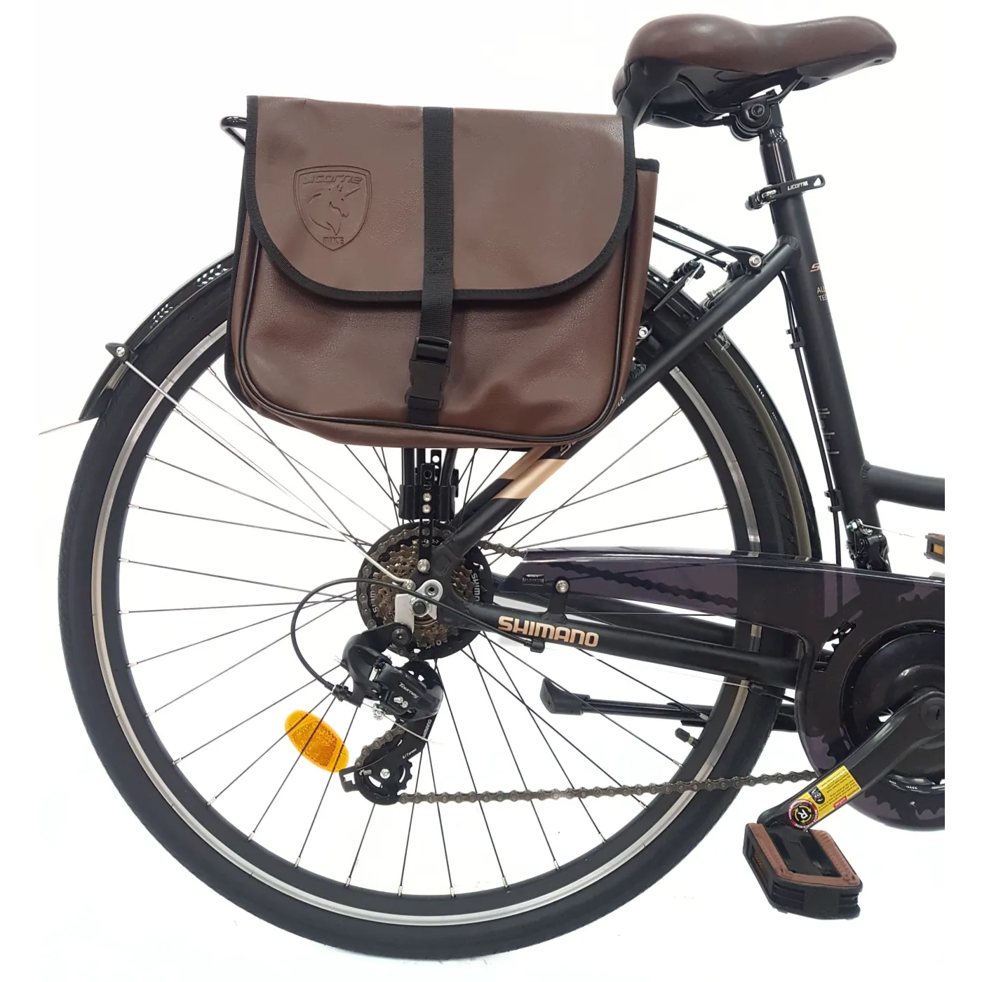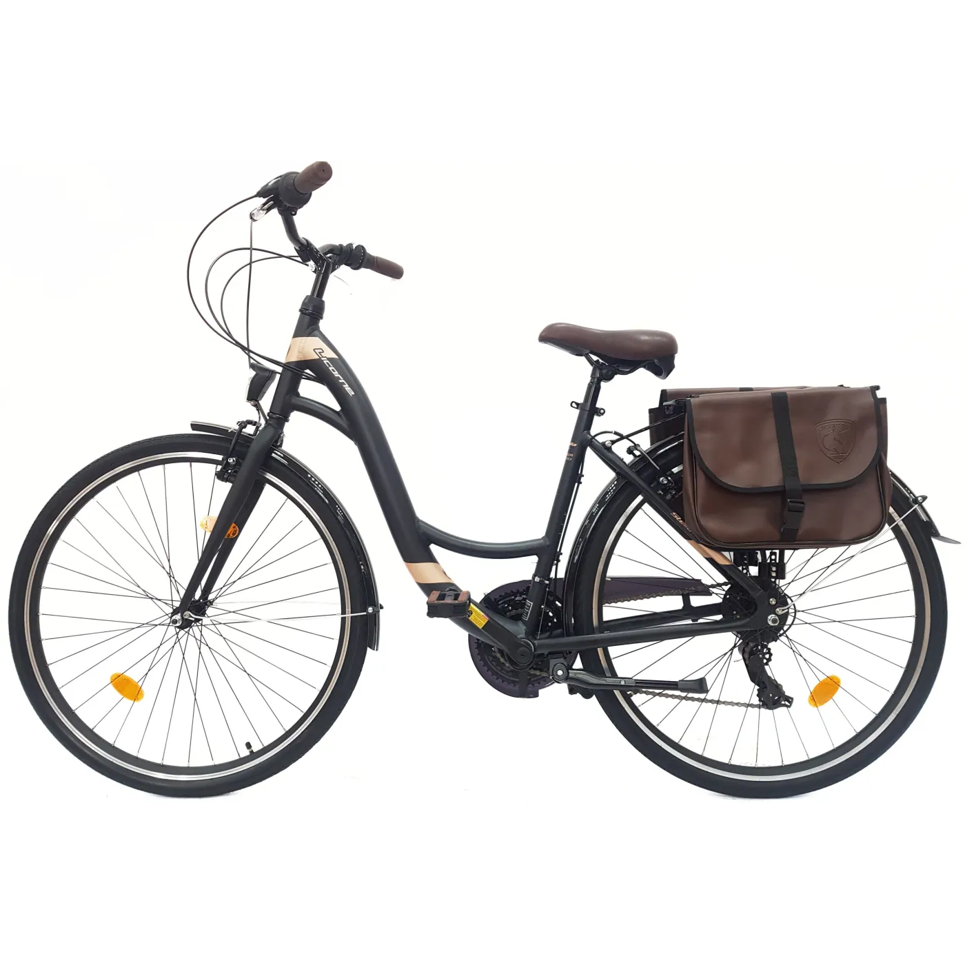 ✨ Rower został wykonany w eleganckim kolorze czarnym z brązowymi wstawkami, co nadaje mu nowoczesnego i stylowego wyglądu. Dodatkowo wyposażony jest w praktyczne akcesoria, takie jak bagażnik, sakwy, światła, dzwonek oraz odblaski, dzięki którym podróż rowerem będzie jeszcze przyjemniejsza i bezpieczniejsza.