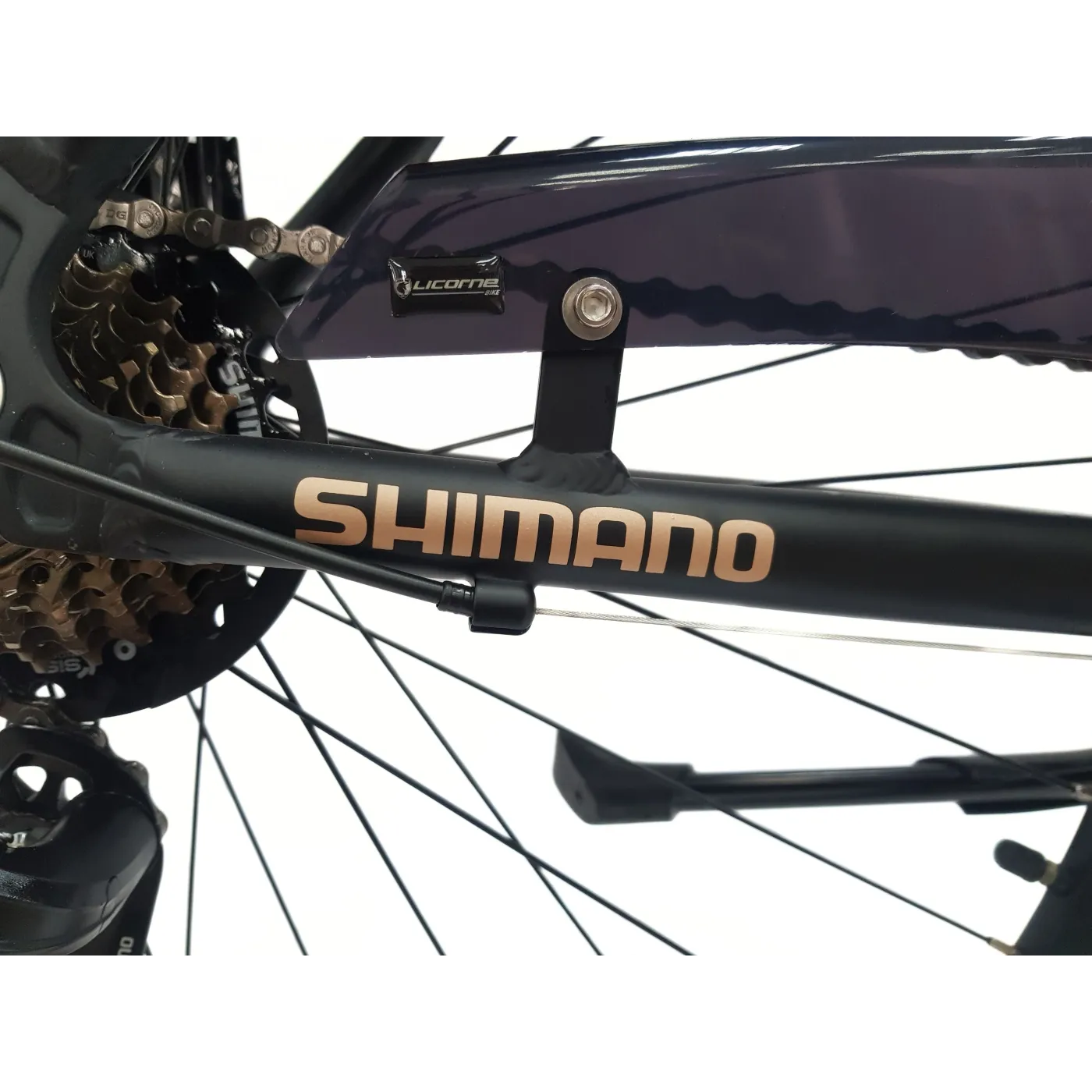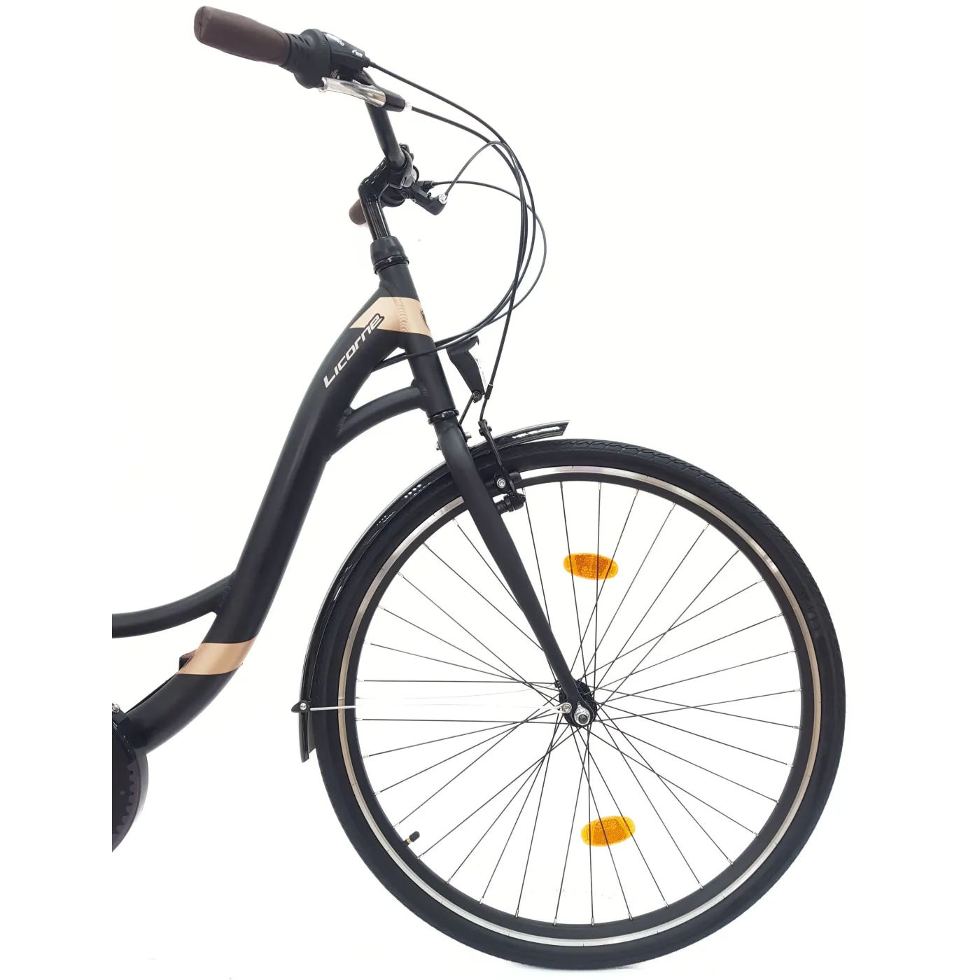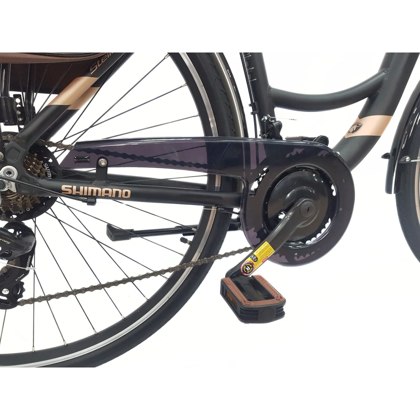 ✨ Rower został wykonany w eleganckim kolorze czarnym z brązowymi wstawkami, co nadaje mu nowoczesnego i stylowego wyglądu. Dodatkowo wyposażony jest w praktyczne akcesoria, takie jak bagażnik, sakwy, światła, dzwonek oraz odblaski, dzięki którym podróż rowerem będzie jeszcze przyjemniejsza i bezpieczniejsza.