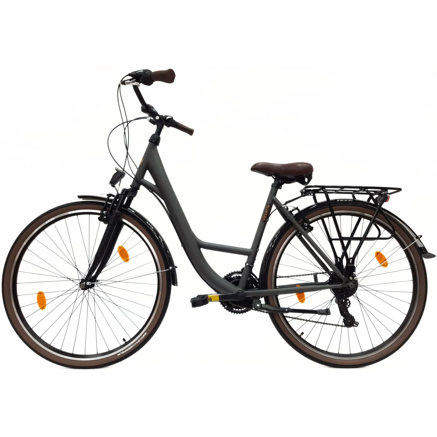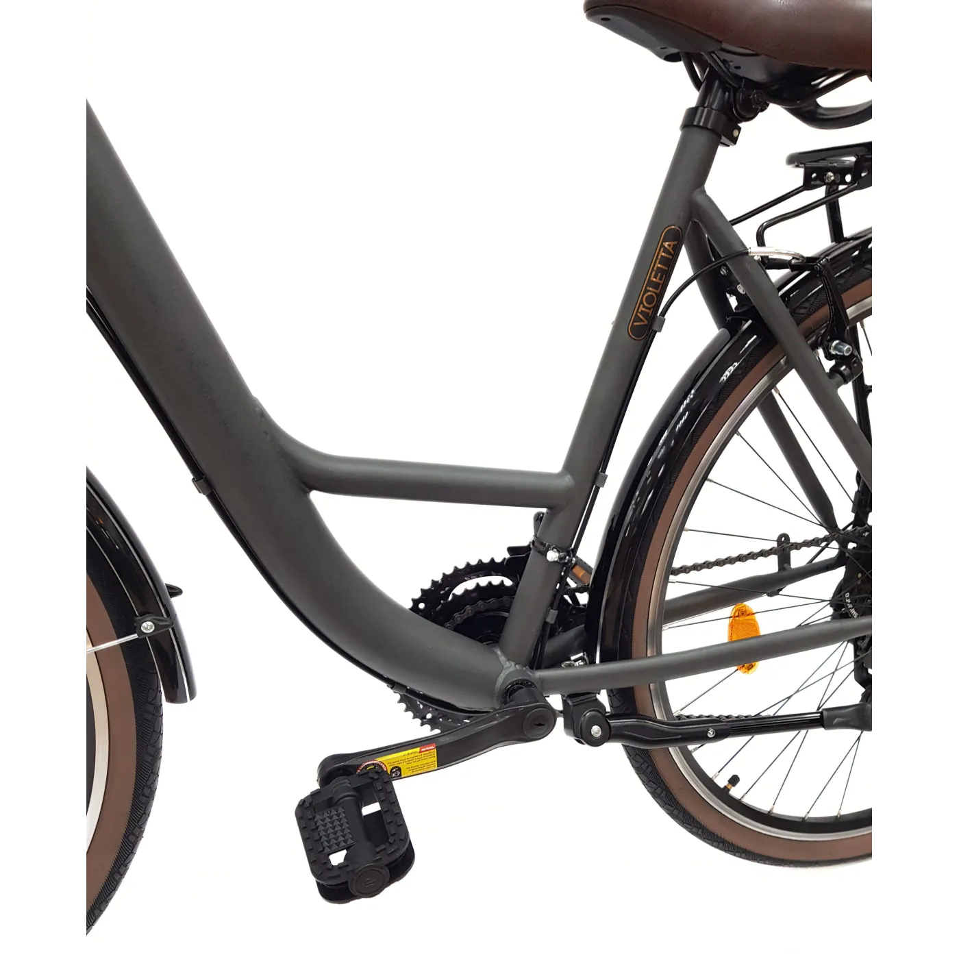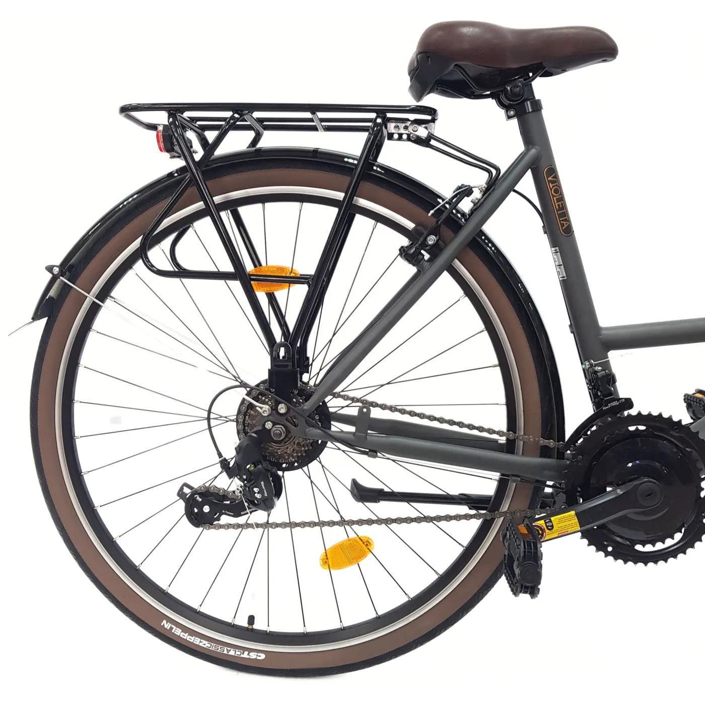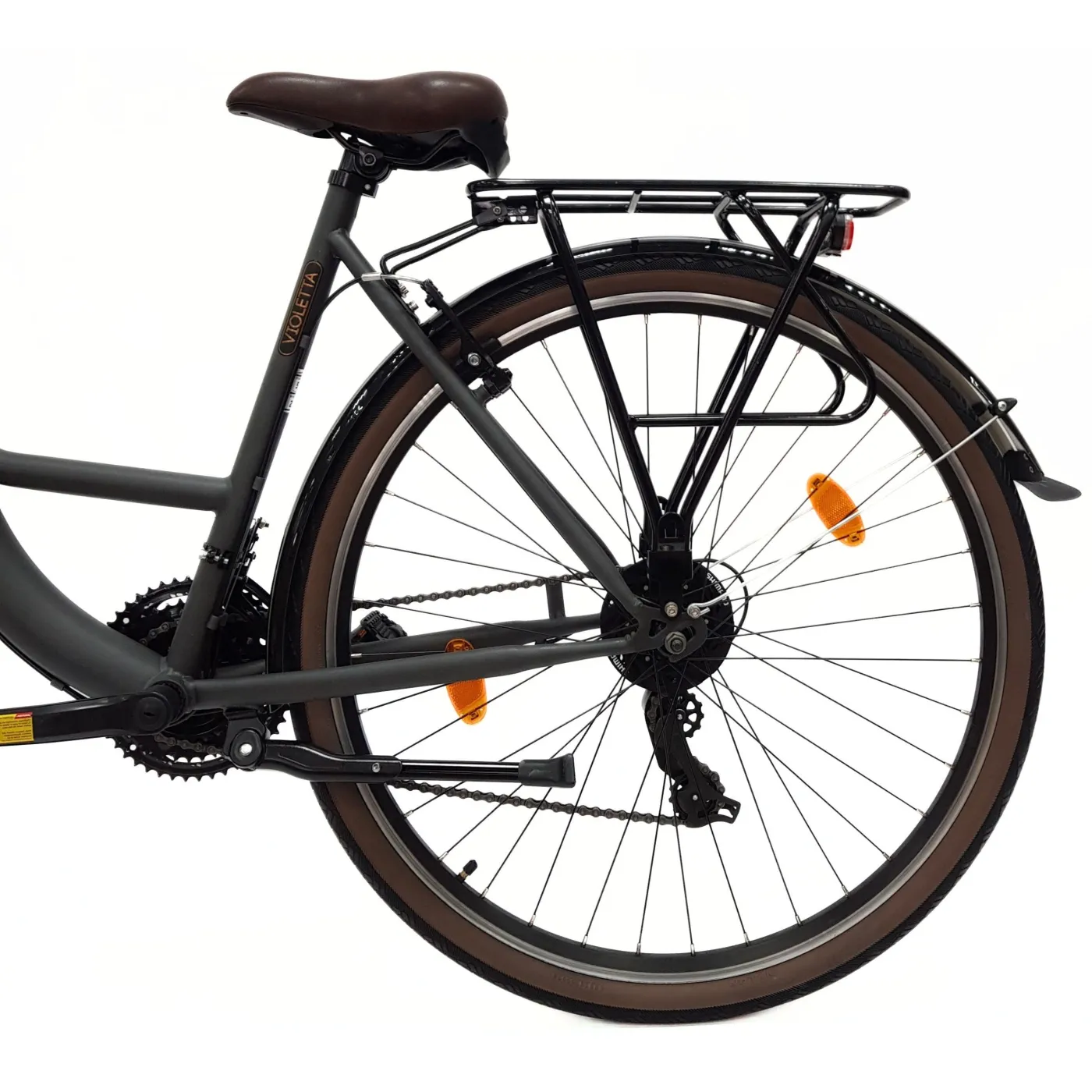 👍🏼 Rower Violetta wyposażony jest w stalową ramę, która gwarantuje stabilność i wytrzymałość. Dzięki temu idealnie sprawdzi się podczas codziennych dojazdów do pracy czy szkoły. Klasyczny design w kolorze antracytowym z brązowymi elementami nadaje mu elegancki wygląd.