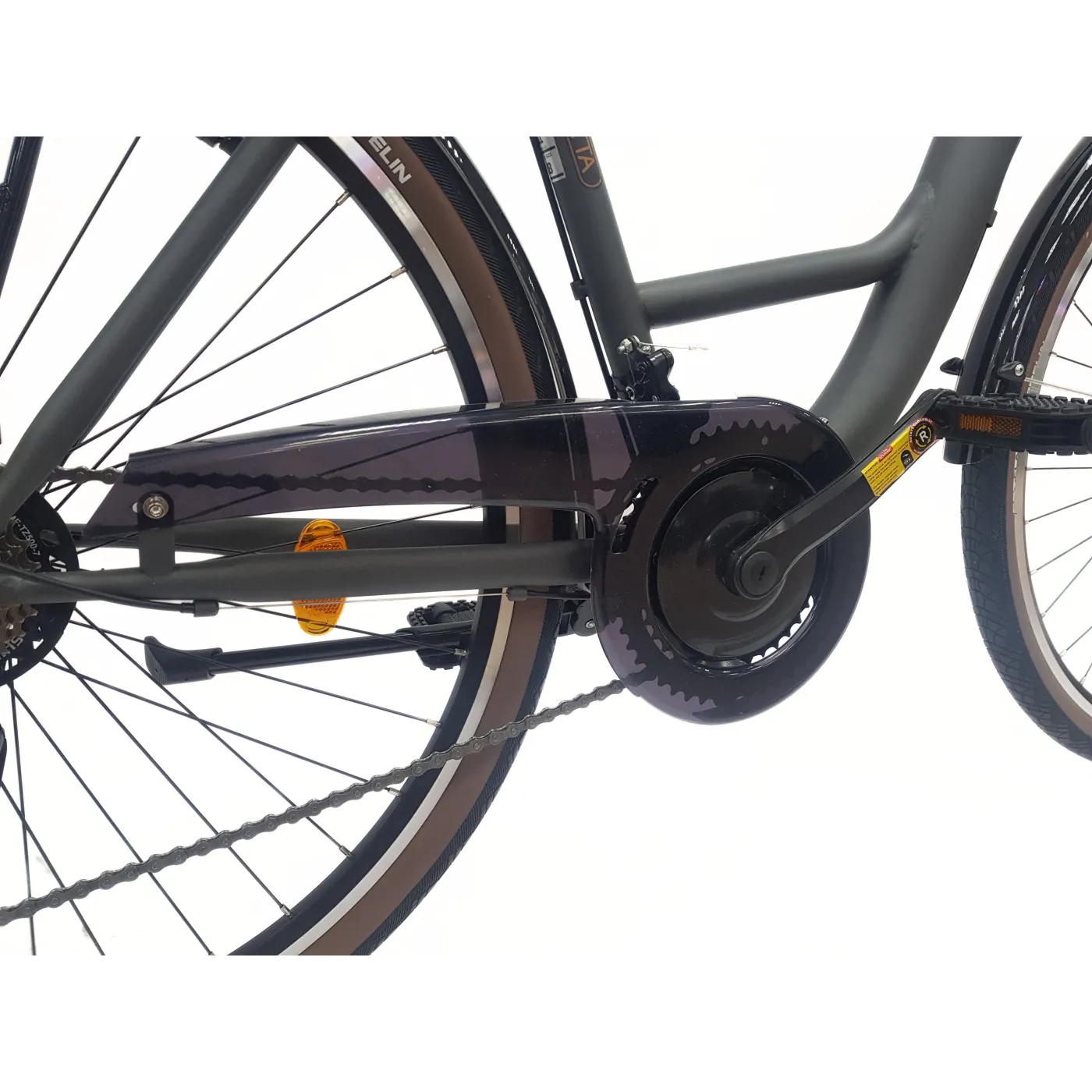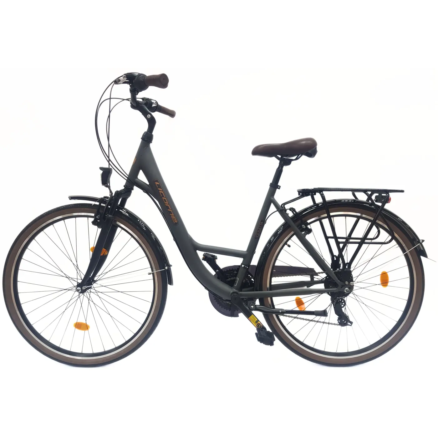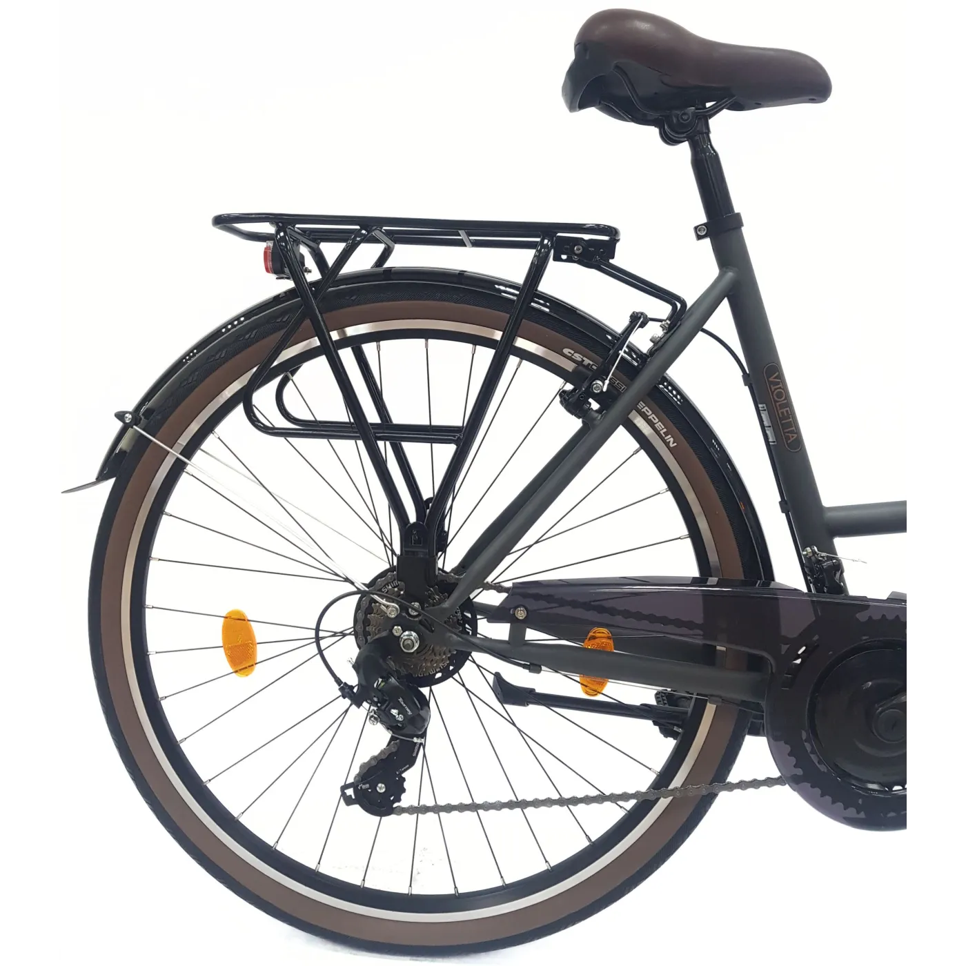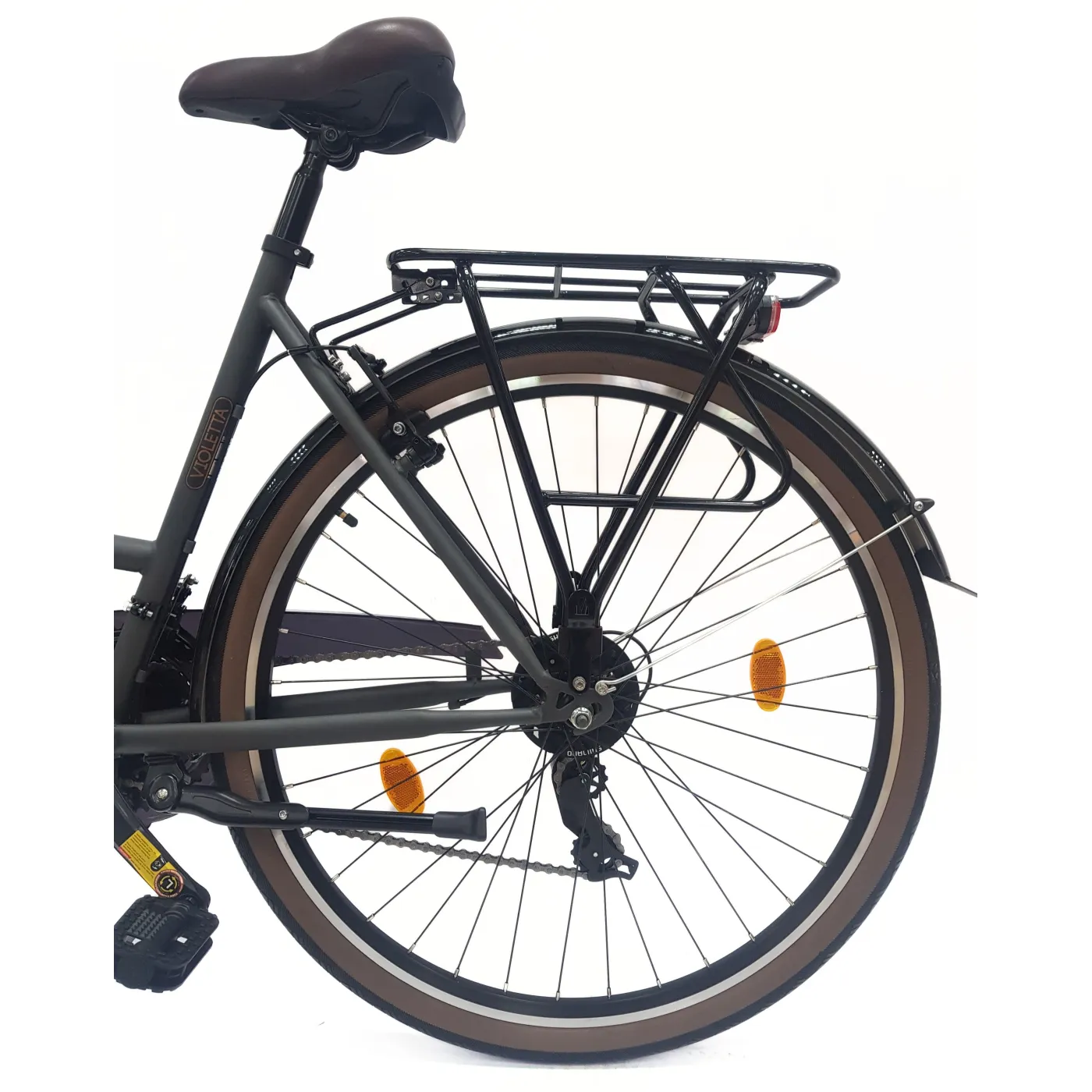 👍🏼 Rower Violetta wyposażony jest w stalową ramę, która gwarantuje stabilność i wytrzymałość. Dzięki temu idealnie sprawdzi się podczas codziennych dojazdów do pracy czy szkoły. Klasyczny design w kolorze antracytowym z brązowymi elementami nadaje mu elegancki wygląd.