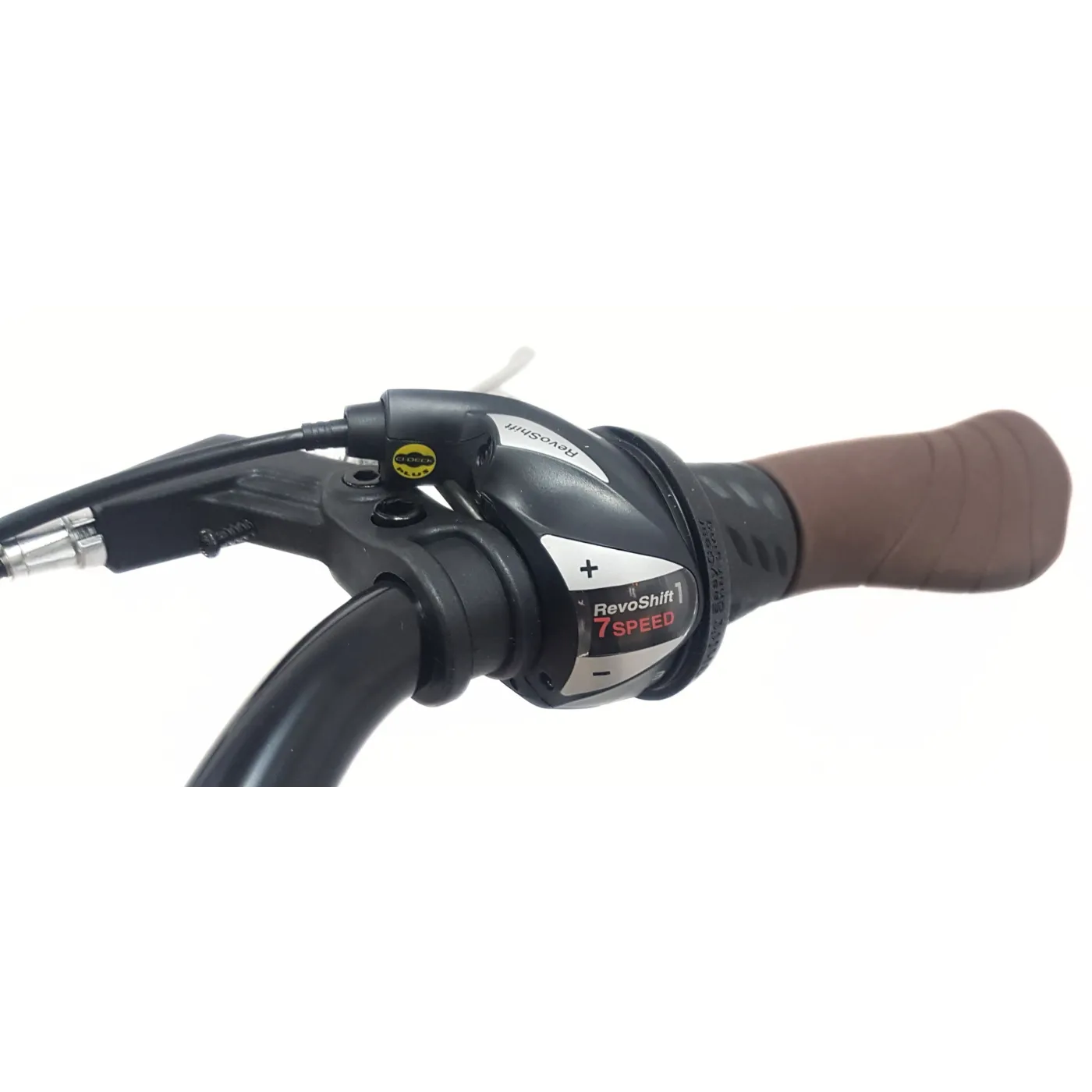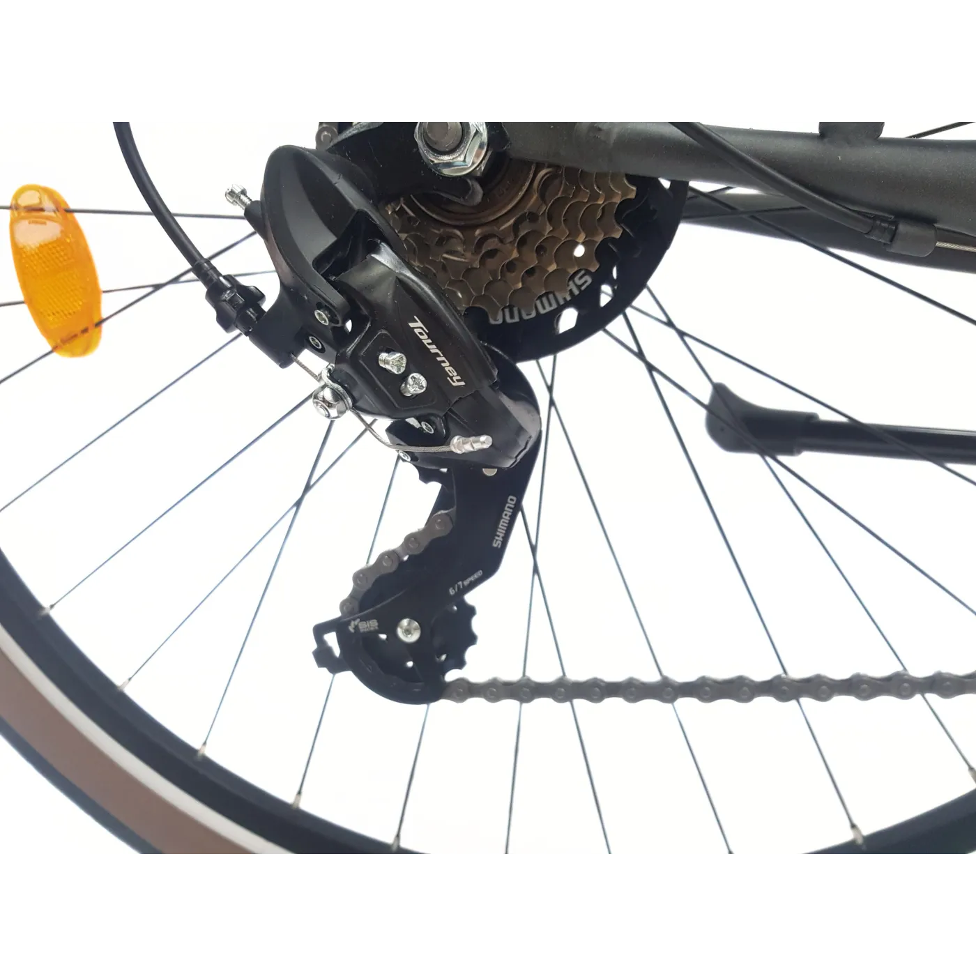 🌟 Hamulce V-brake zapewniają skuteczne i bezpieczne hamowanie w każdej sytuacji. Dzięki przerzutkom Shimano 21 biegów oraz manetce obrotowej Revoshift można precyzyjnie dostosować prędkość do warunków na drodze, zapewniając płynną jazdę bez zbędnego wysiłku.