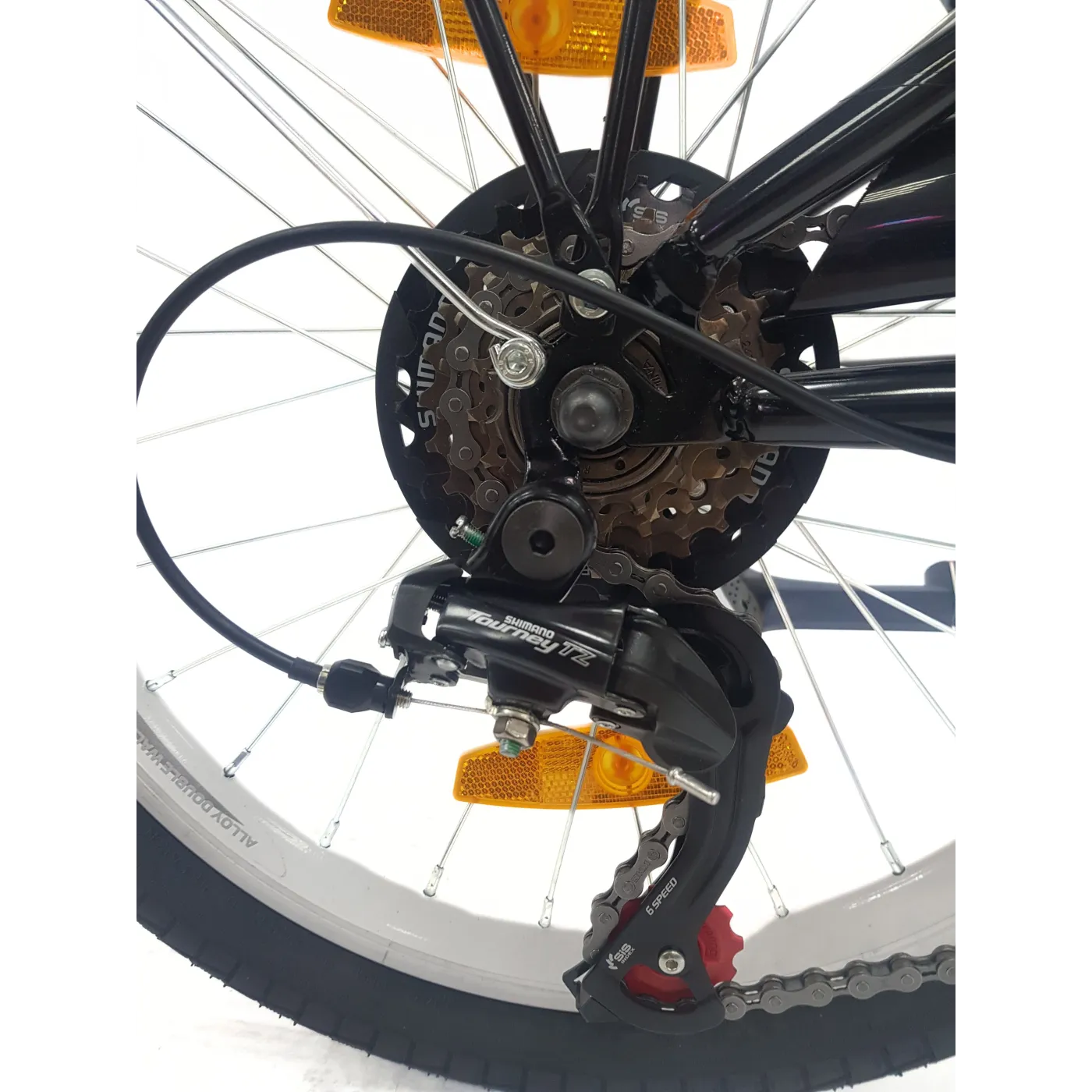 🔧 Dla większego komfortu jazdy i możliwości dostosowania prędkości do warunków terenowych, rower wyposażono w 6-biegową przerzutkę Shimano oraz manetkę obrotową Revoshift, co pozwala na płynne i precyzyjne zmiany biegów. Opony w rozmiarze 20" x 1,95" gwarantują dobrą przyczepność do podłoża i komfort jazdy zarówno po asfalcie, jak i lekko piaszczystych ścieżkach.