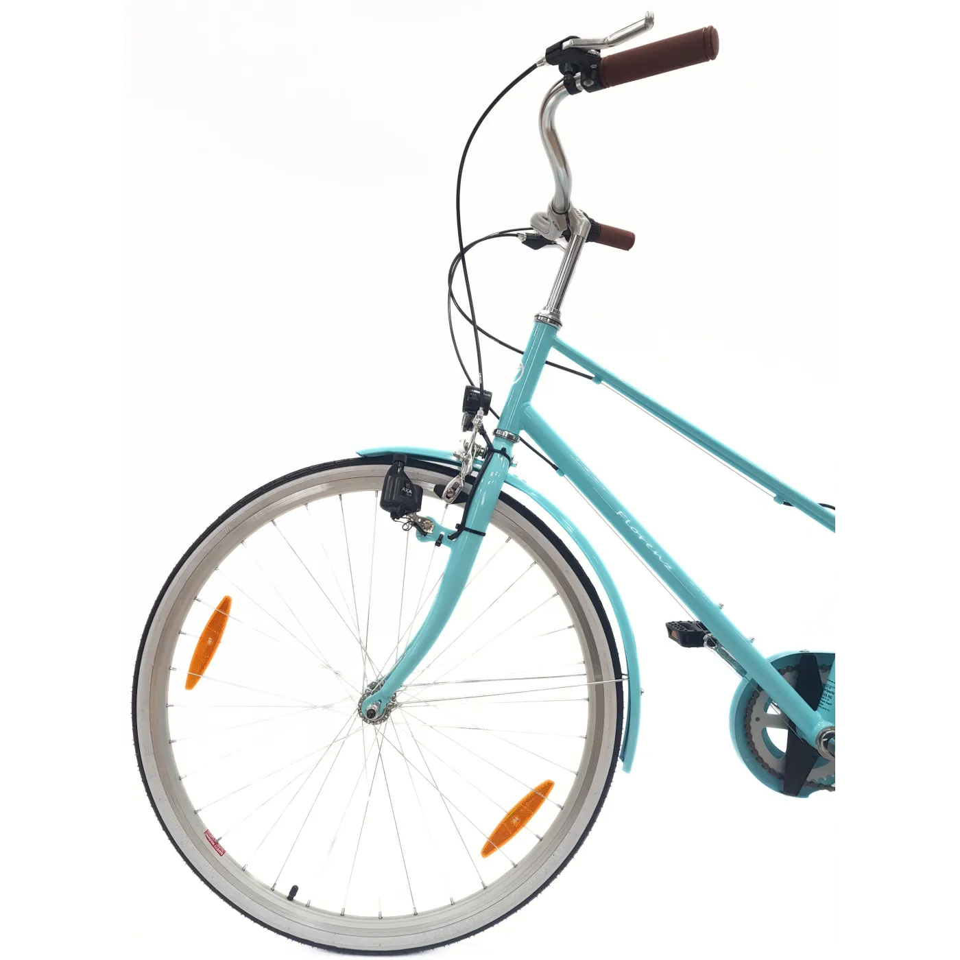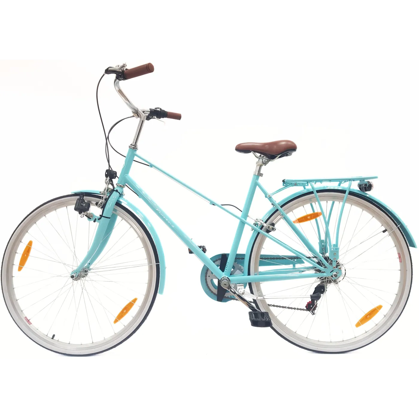 🔧 Stalowa rama trapezowa podkreśla klasyczny design roweru miejskiego z dzieloną górną rurą. Rower ma przyjemnie wyważoną geometrię i pozwala siedzieć w pozycji wyprostowanej na miękkim, wygodnym siodełku. Wygięta kierownica wspiera łagodną postawę.