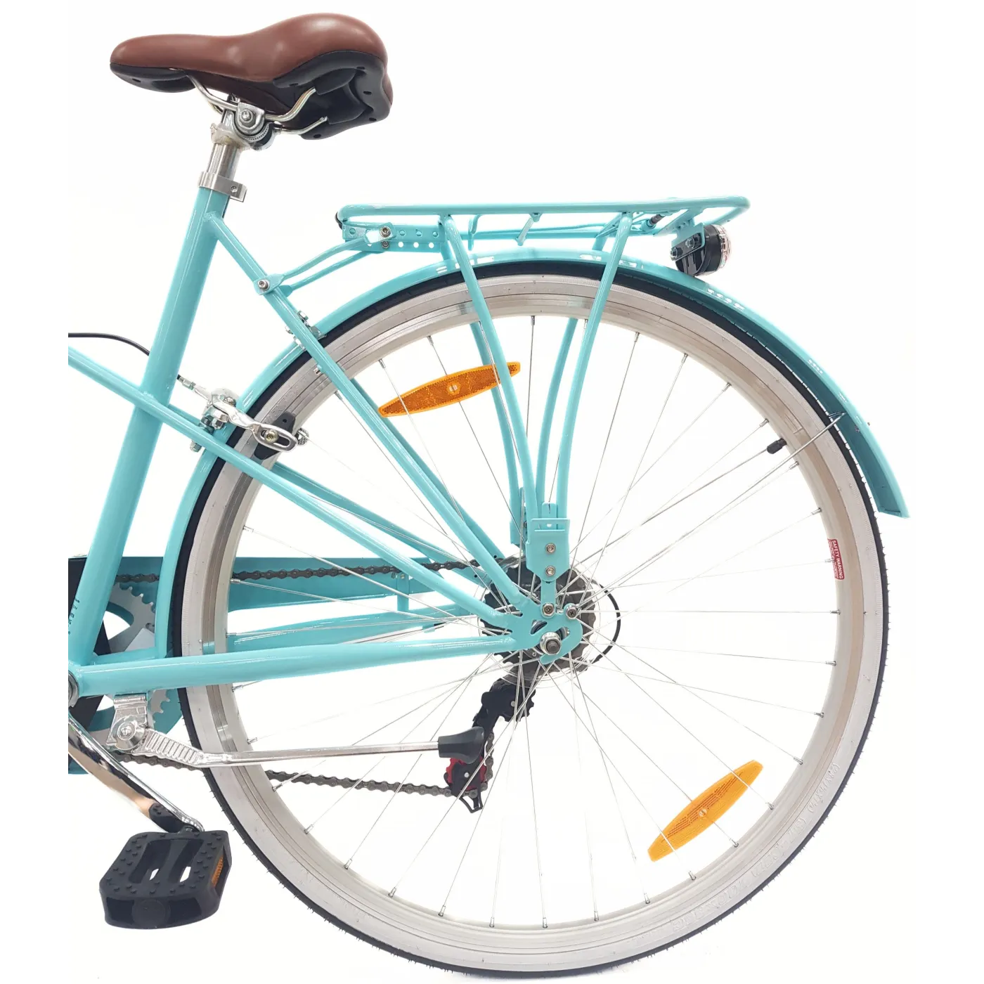 ✨ Rower retro posiada bogate wyposażenie składające się z oświetlenia na dynamo (przód), bezpiecznego dla ruchu drogowego, zgodnego z StVZO, osłony łańcucha, błotników, stopki bocznej i praktycznego bagażnika.
