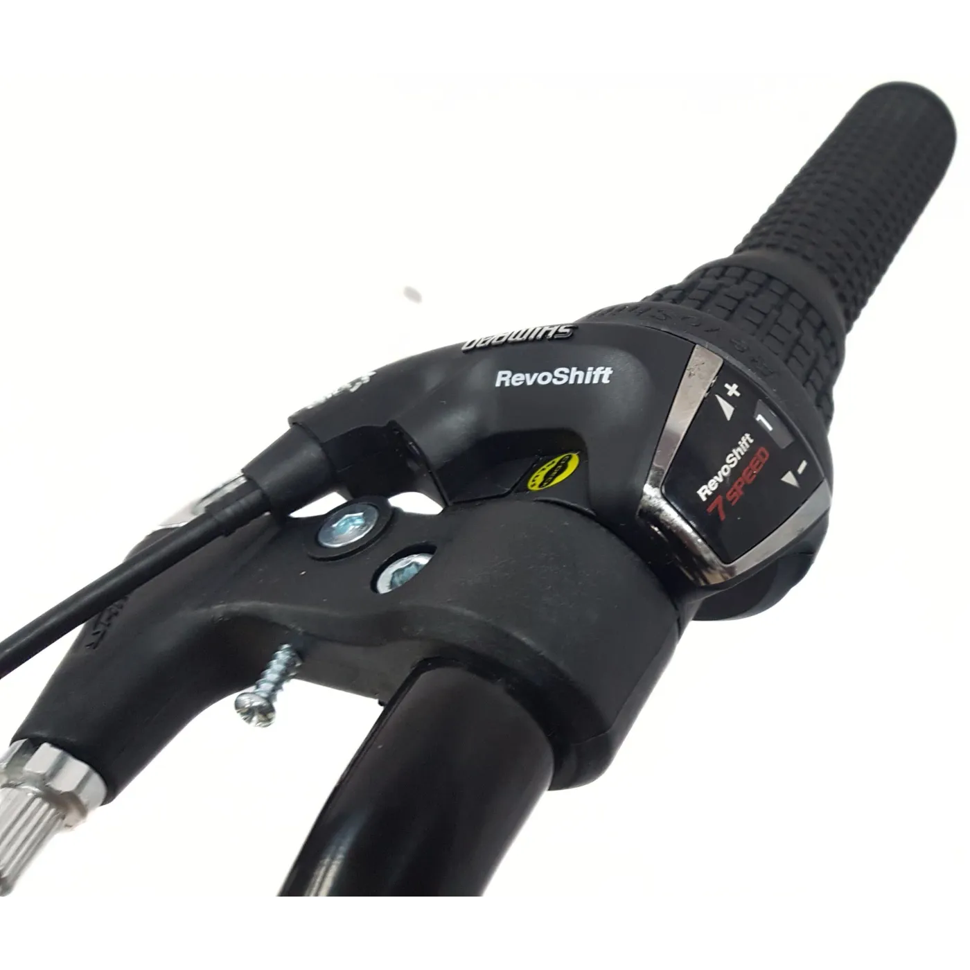 👌 Rower wyposażony jest w hamulce tarczowe mechaniczne z przodu i z tyłu, które gwarantują skuteczne i pewne zatrzymywanie się w każdych warunkach. 21-biegowa przerzutka SHIMANO pozwala na łatwą zmianę przełożeń, a manetka obrotowa Shimano RevoShift zapewnia płynne i precyzyjne zmiany biegów.