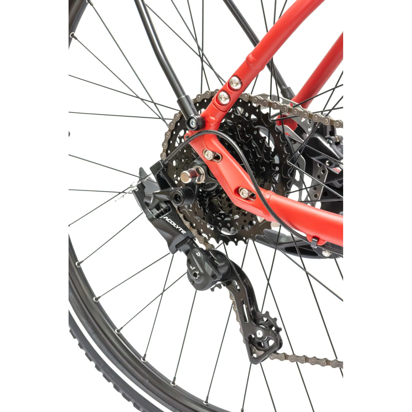 ⚙️ Wyposażony w osiem biegów oraz zewnętrzną przerzutkę Microshift Acolyte każdy użytkownik może dostosować swoją jazdę do różnych warunków terenowych. Manetka cynglowa umożliwia płynne zmiany biegów, co przekłada się na komfortową jazdę w każdym terenie.