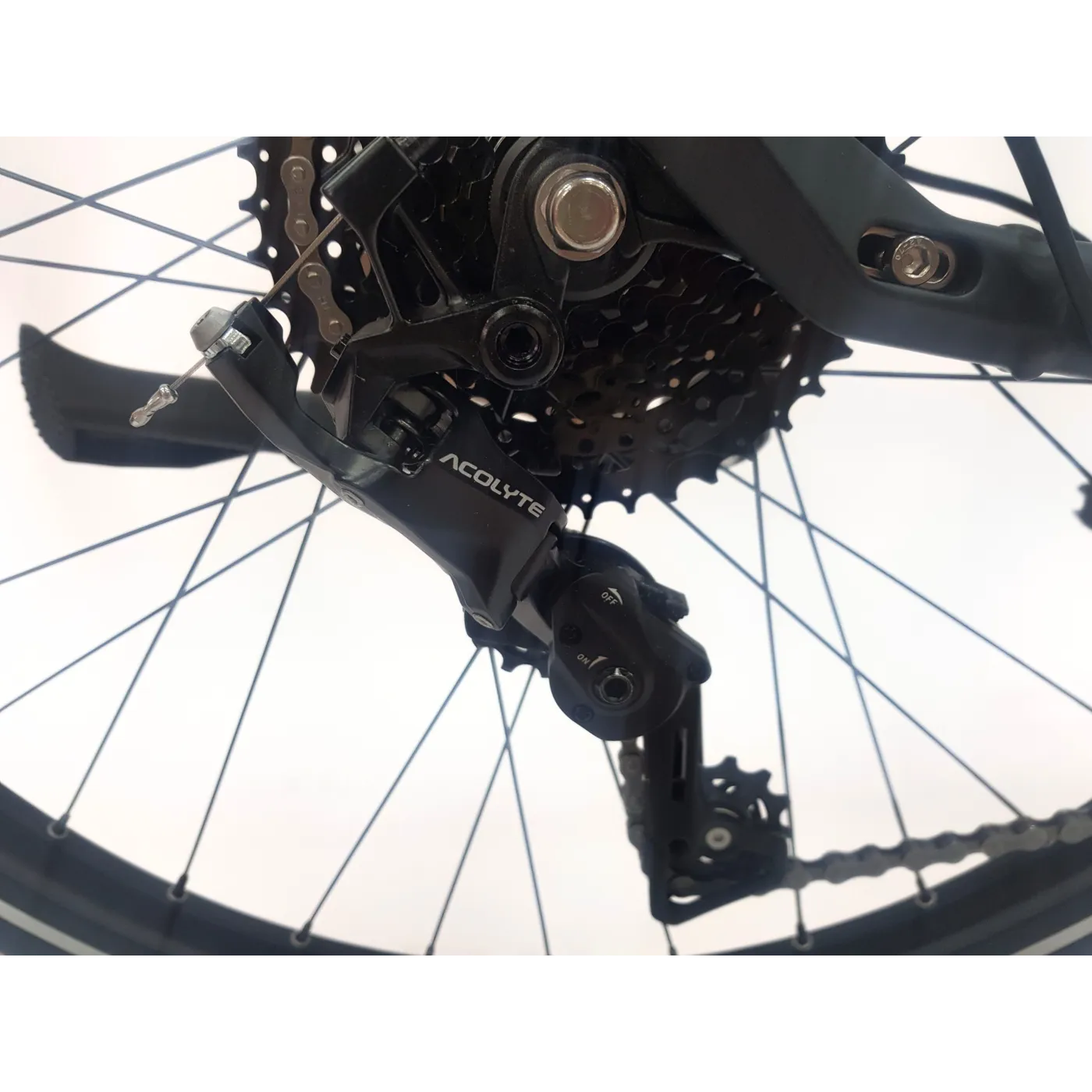 ⚙️ Wyposażony w osiem biegów oraz zewnętrzną przerzutkę Microshift Acolyte każdy użytkownik może dostosować swoją jazdę do różnych warunków terenowych. Manetka cynglowa umożliwia płynne zmiany biegów, co przekłada się na komfortową jazdę w każdym terenie.