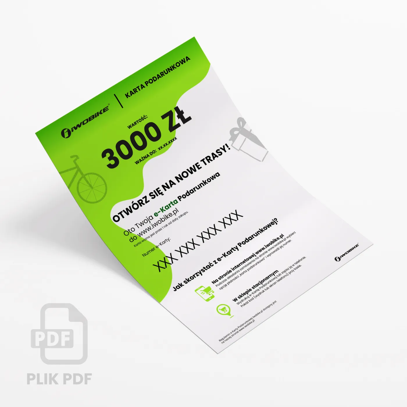 Karta Wirtualna iwobike jest dostępna w formie PDF i trafia prosto na maila zaraz po zakupie. Możesz ją wygodnie przesłać dalej w wersji elektronicznej albo wydrukować i wręczyć jako elegancki prezent na papierze.