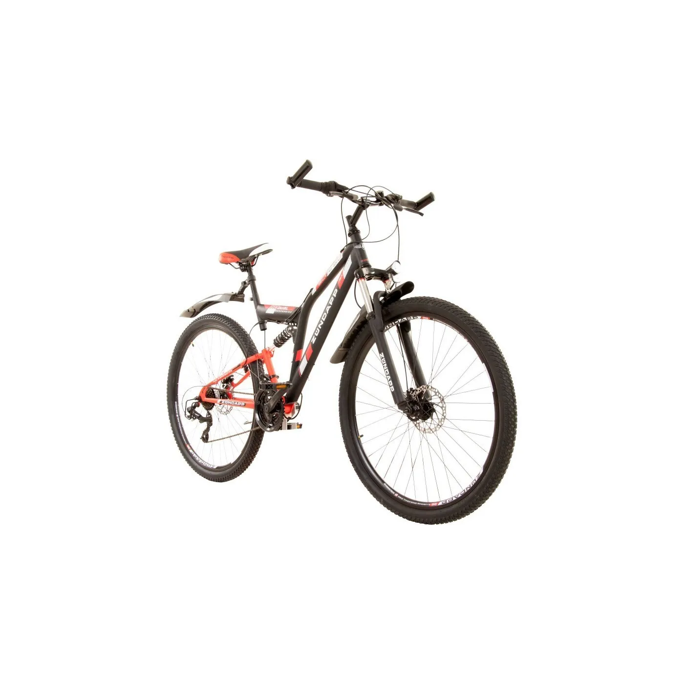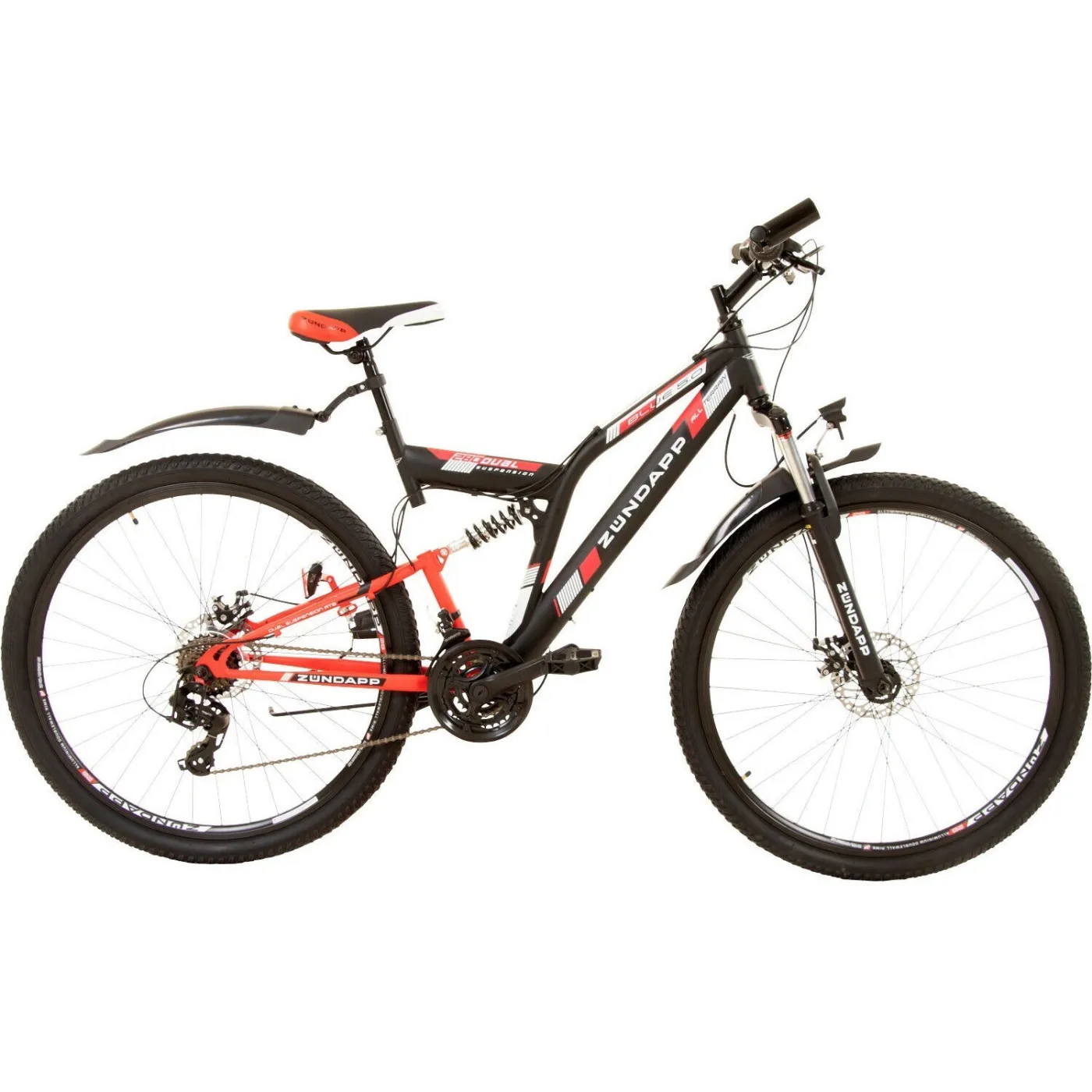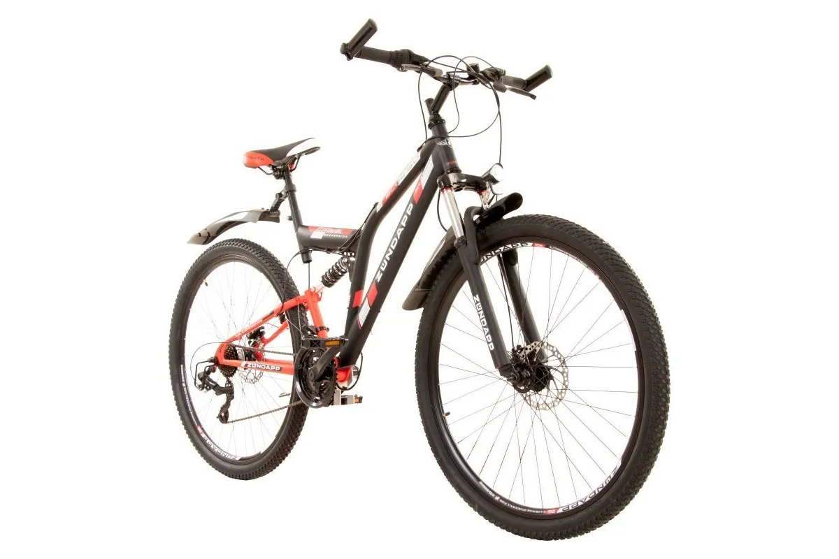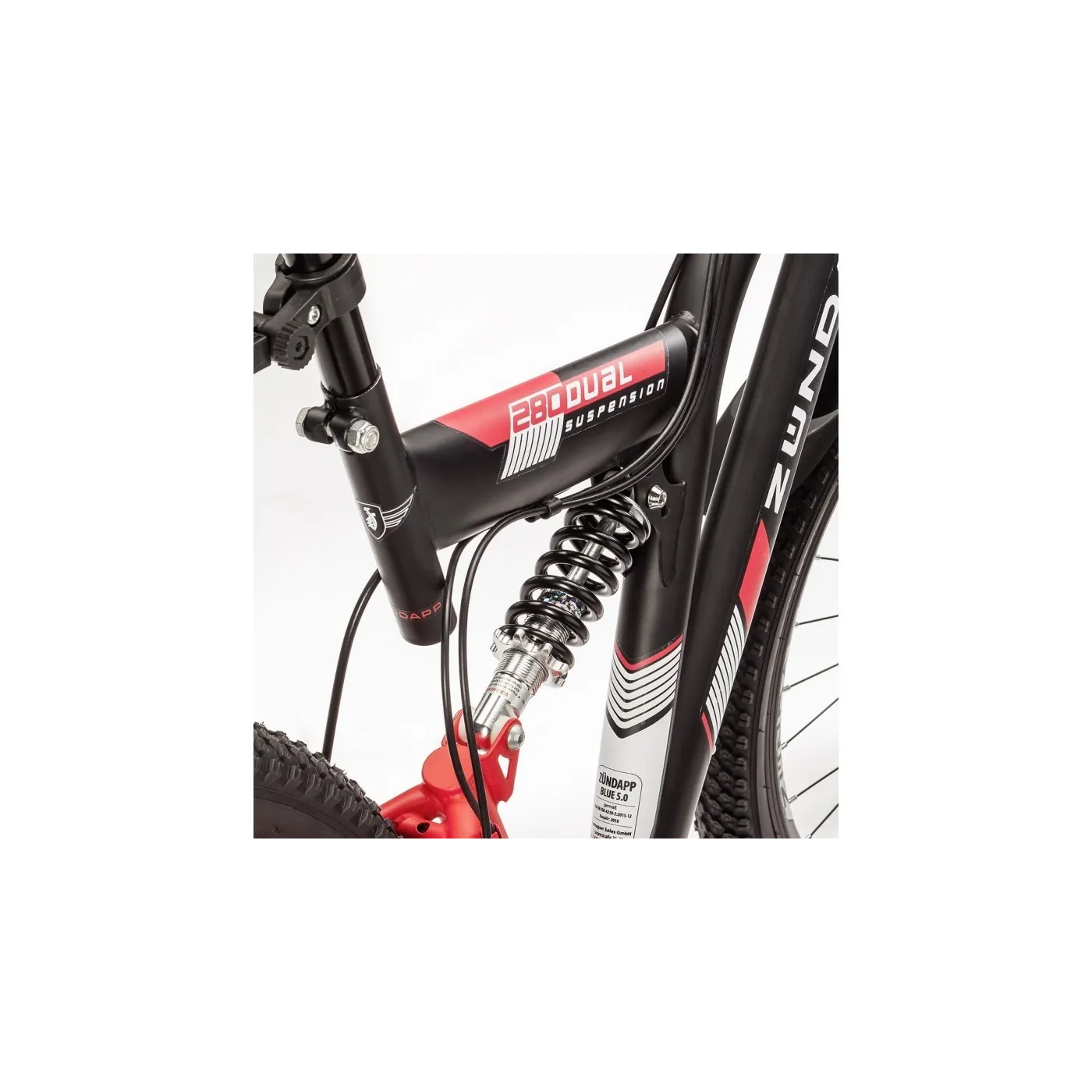 Rower górski z pełnym zawieszeniem amortyzuje nierówności podłoża dzięki doskonałej i skutecznie dba o wygodę rowerzysty podczas jazdy poza utwardzonymi szlakami. Zawieszenie ramy ma również pozytywny wpływ na zachowanie podczas jazdy, ponieważ zapewnia płynniejszą jazdę i łatwiejszą kontrolę nad rowerem. W Zündapp Blue 5.0 zainstalowano niewymagający konserwacji amortyzator ze sprężyną gazową, który można dostosować do indywidualnej wagi kierowcy, aby osiągnąć maksymalny komfort. Z przodu widelec amortyzowany Zoom ma 100 mm skoku, aby odciążyć ramiona i barki.