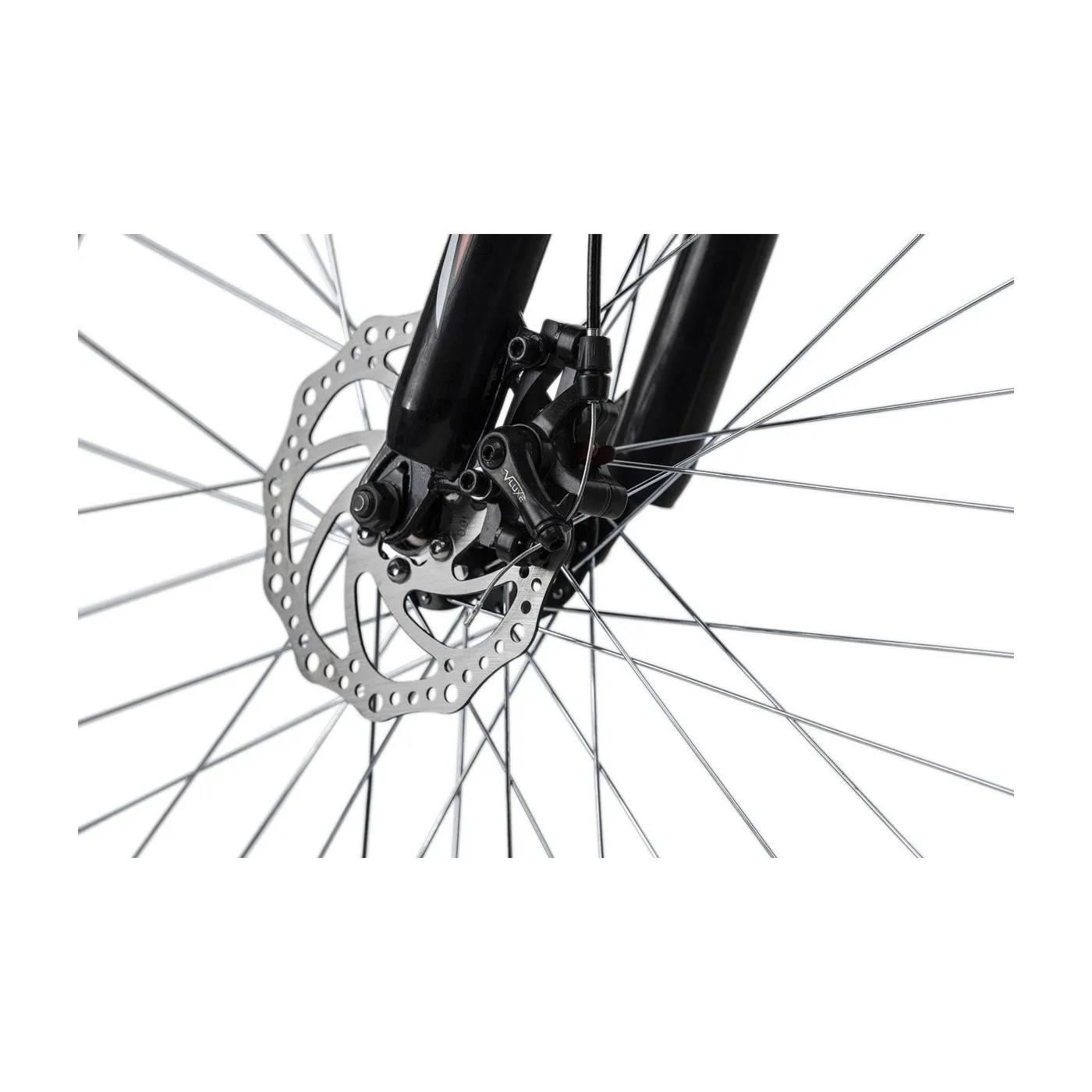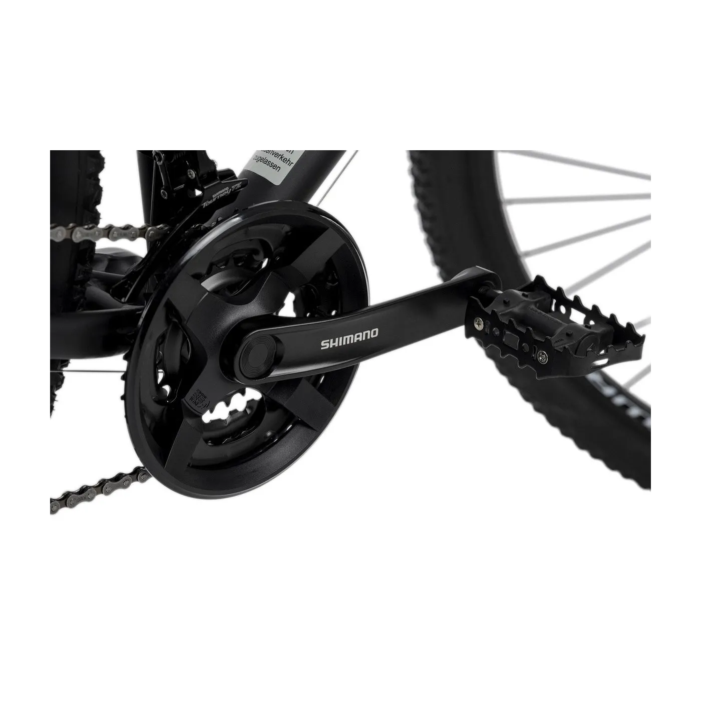 Rower wyposażony jest w 21-biegową przerzutkę z komponentami Shimano. Mechaniczne hamulce tarczowe z przodu i tyłu zapewniają niezbędne wyhamowanie. Ergonomiczne siodełko idealnie pasuje do ogólnego obrazu.