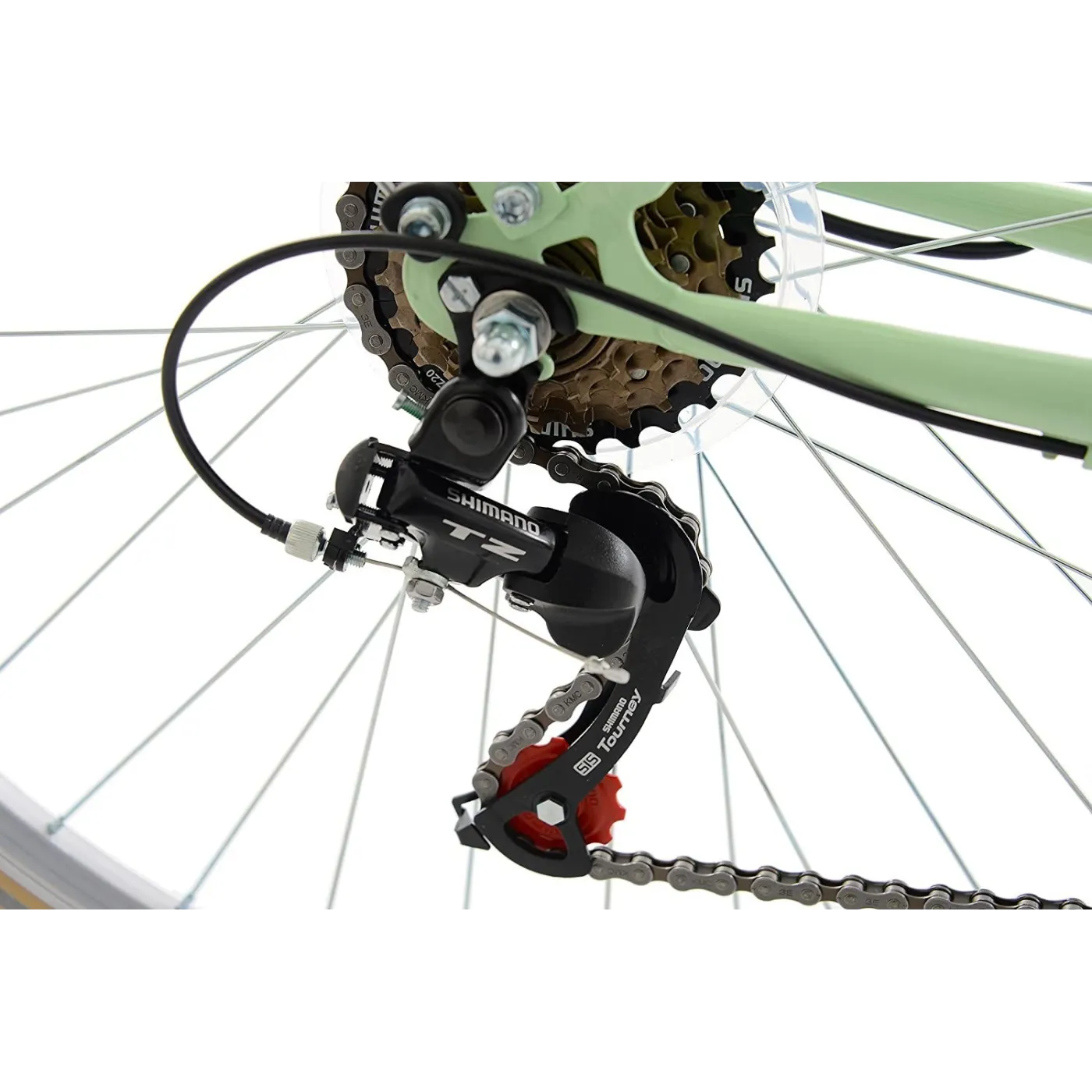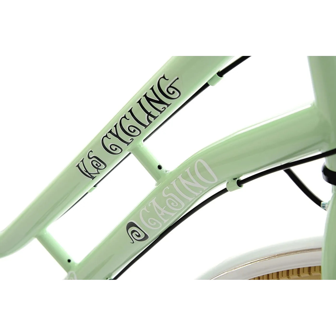 Kobiecy klasyczny rower Casino umili każdą miejską podróż! 6 biegów Shimano oraz hamulce V-brake pozwolą na komfortowe przemieszczanie się po ulicach, a reflektor zasilany przez dynamo oświetli drogę po zmroku.