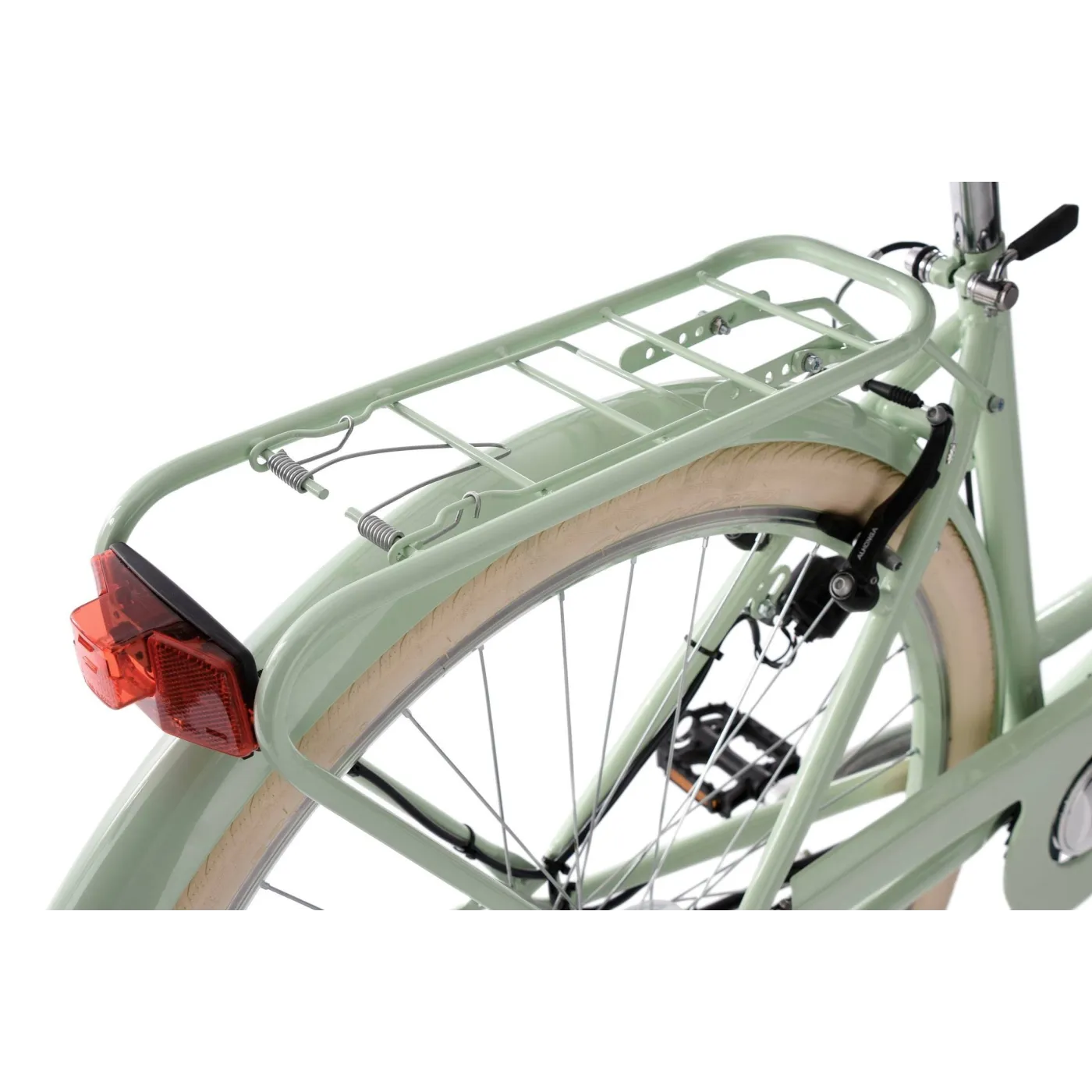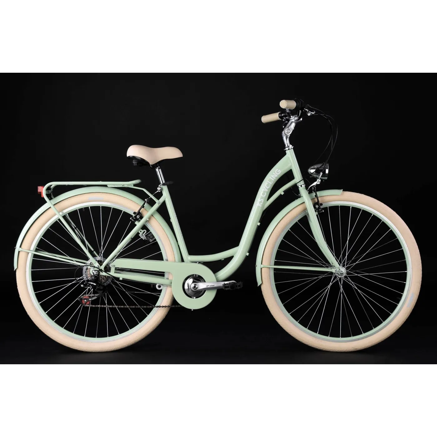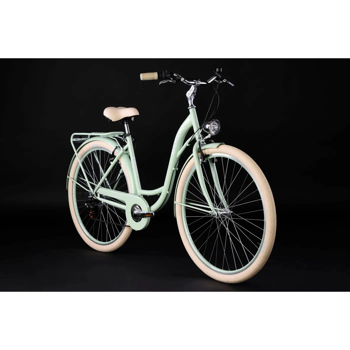 Śliczny rower miejski, w kolorze zielonym z pewnością przyciągnie wzrok niejednej mijanej osoby. Wyposażony w "balonowe" opony ze specjalnym pneumatycznym zawieszeniem! Dzięki temu niwelowane są wstrząsy i tym samym zwiększa się komfort jazdy. Ponadto rower wyposażony jest w 6-biegową przerzutkę Shimano, oświetlenie zasilane dynamo oraz bagażnik.