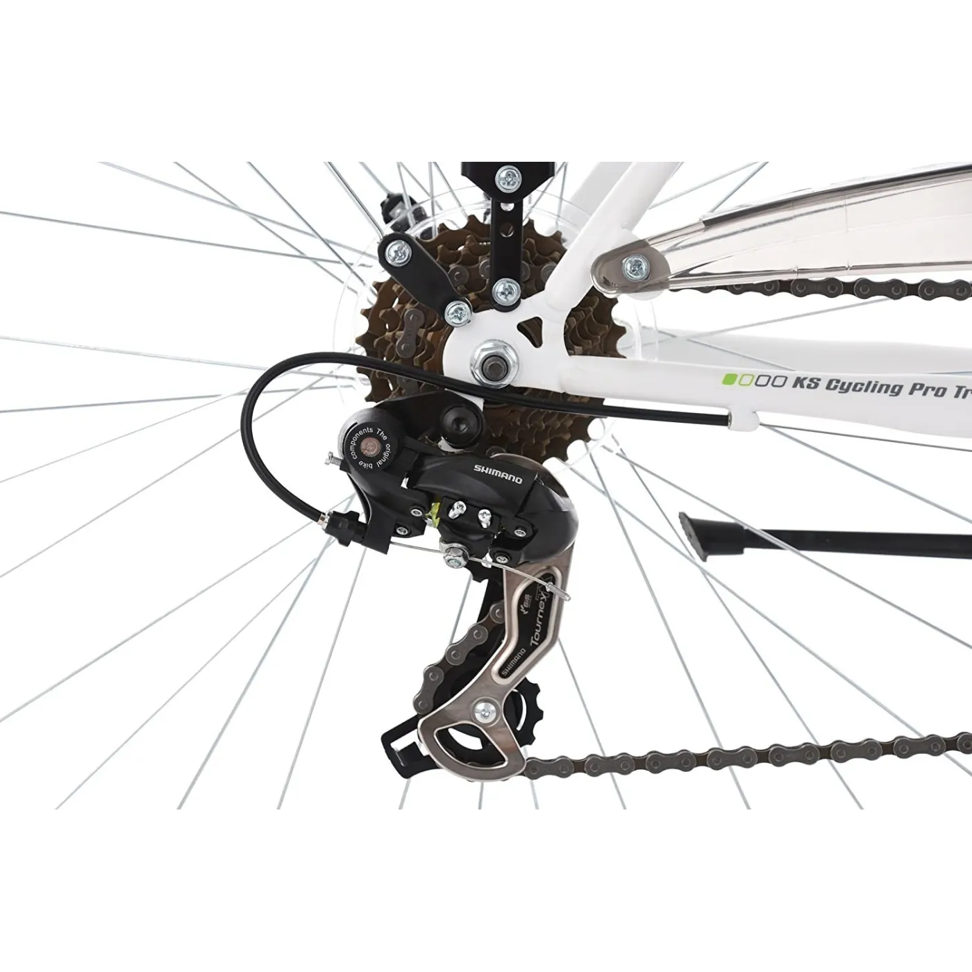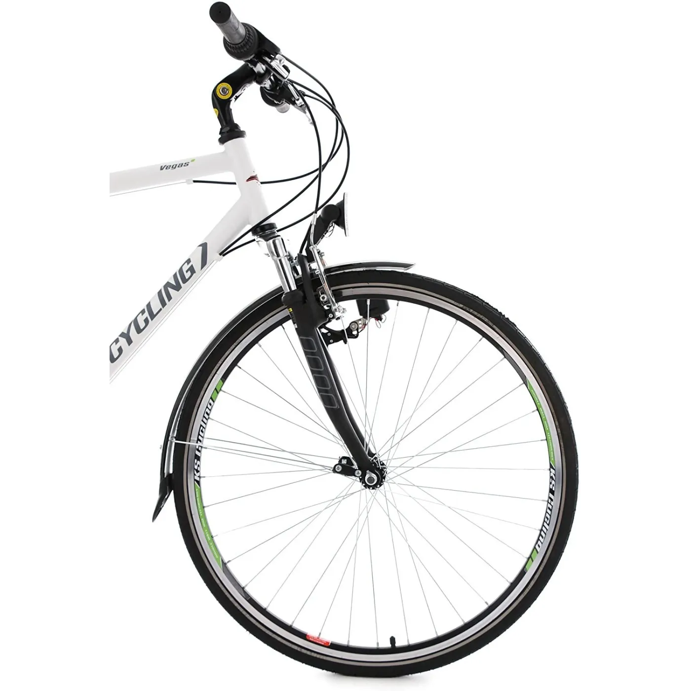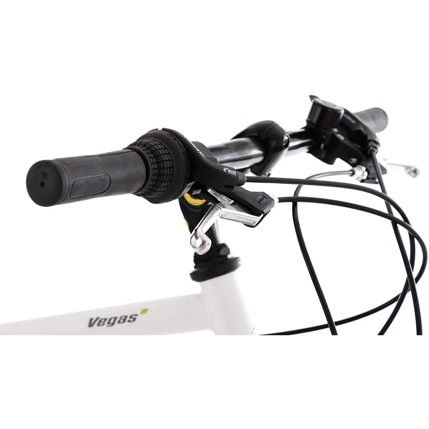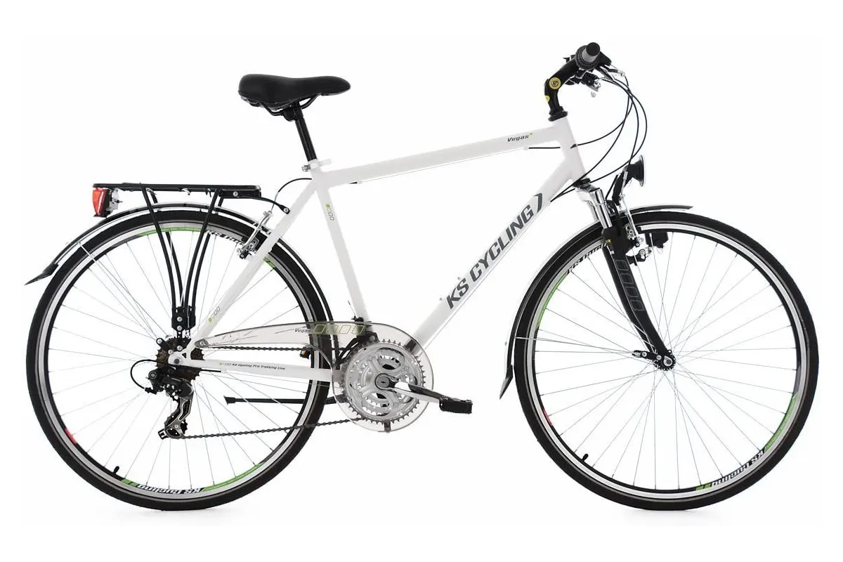 Rower trekkingowy Vegas marki KS Cycling, idealnie nadaje się zarówno do jazdy po mieście, jak i na dłuższe trasy. Biała rama sprawia, że rower prezentuje się bardzo elegancko. Podczas dłuższej wycieczki możesz też skorzystać z bagażnika, na którym przewieziesz wszystkie niezbędne rzeczy. Prosta szeroka kierownica zapewni dobrą kontrolę nad rowerem podczas jazdy, a regulowany wspornik kierownicy pozwoli na ustawienie optymalnej dla Ciebie pozycji. Dzięki przerzutce SHIMANO Tourney z 21 biegami żadne wzniesienie nie będzie już problemem. Biegi łatwo zmienisz za pomocą prostych w obsłudze i intuicyjnych manetek SHIMANO RevoShift. Poza tym rower posiada widelec, który zamortyzuje drobne nierówności terenu.