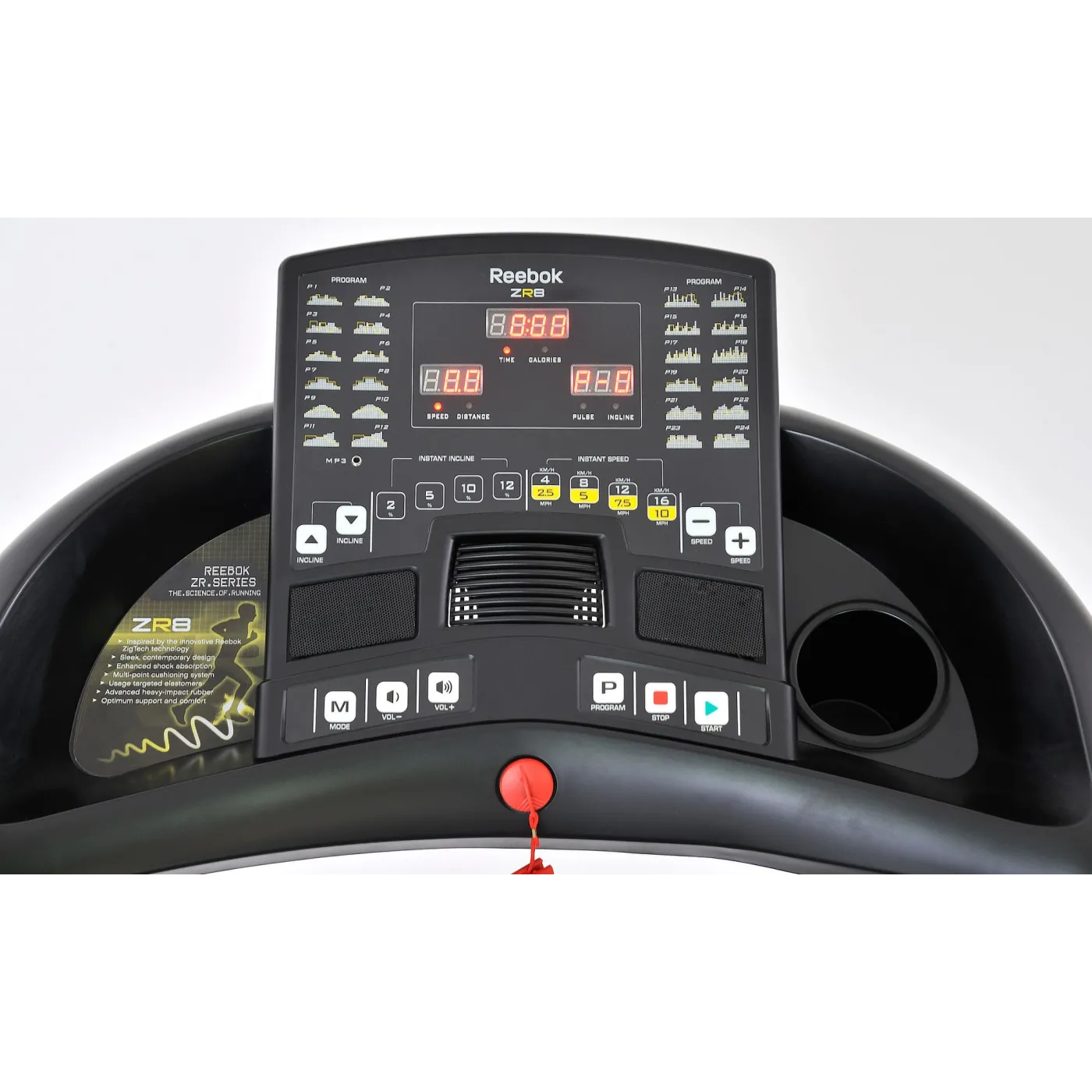 Dzięki technologii amortyzacji ZigTech zastosowanej w bieżni ZR8, zmęczenie mięśni oraz obciążenie stawów znacznie zmniejsza się. Integralną częścią bieżni z serii ZR jest innowacyjny system składania Soft Drop, który umożliwia łatwe i sprawne złożenie bieżni. ZR8 posiada 24 stałe, zdefiniowane programy będące kombinacją różnego stopnia nachylenia bieżni i zmiennej prędkości, aby pomóc użytkownikowi pracować nad różnymi partiami ciała. Całość dopełnia wyjątkowy, elegancki, czarny design obudowy.