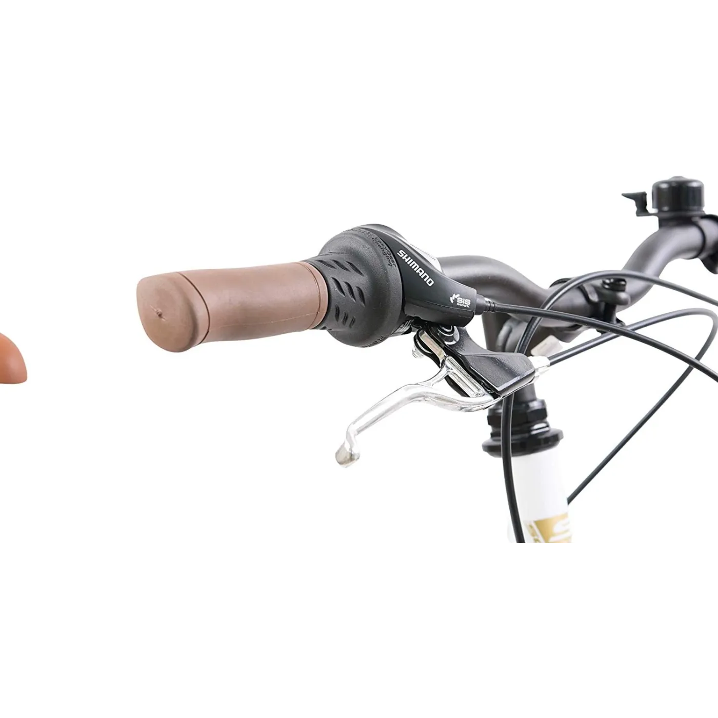 Wysoka kierownica i wygodne siodełko zapewnią komfort jazdy, a gripy, koszyk i brązowe wykończenie dodają uroku. Rower wyposażony jest w hamulce v-brake oraz 7 biegów, dzięki którym dopasuje się do warunków miejskich. Zamontowane oświetlenie pozwoli na podróżowanie nawet po zmroku!