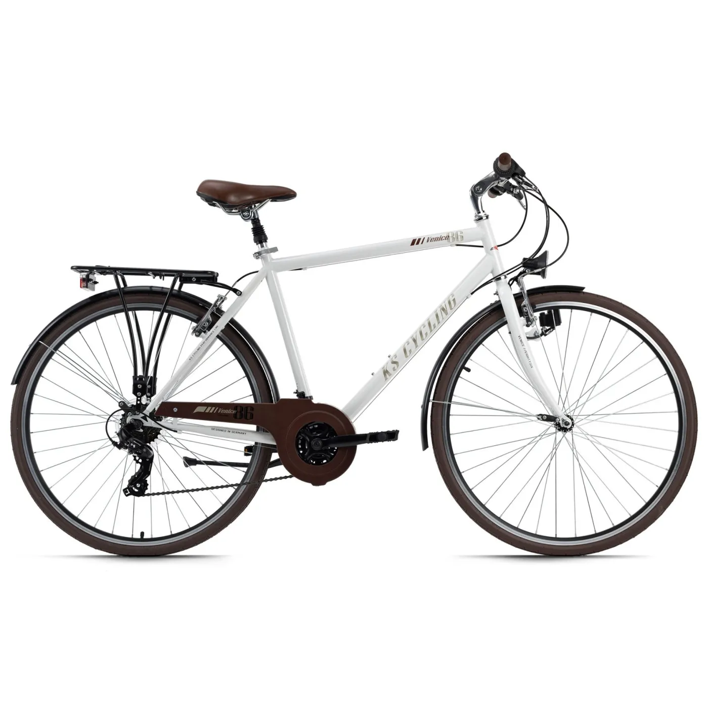 Z 28-calowym rowerem trekkingowym Venice jesteś doskonale przygotowany do pokonywania długich dystansów w wolnym czasie lub korzystania z roweru w życiu codziennym. Ten w pełni wyposażony rower turystyczny przekonuje łatwymi w utrzymaniu, wytrzymałymi komponentami, przyjemnymi wrażeniami z jazdy i najlepszym stosunkiem ceny do wydajności. Dzięki 21 biegom w napędzie łańcuchowym możesz bez problemu wspinać się na każde wzniesienie. Hamulce szczękowe wykonują wszystkie procesy hamowania szczególnie precyzyjnie i szybko i wymagają znacznie mniej konserwacji niż hamulce tarczowe.