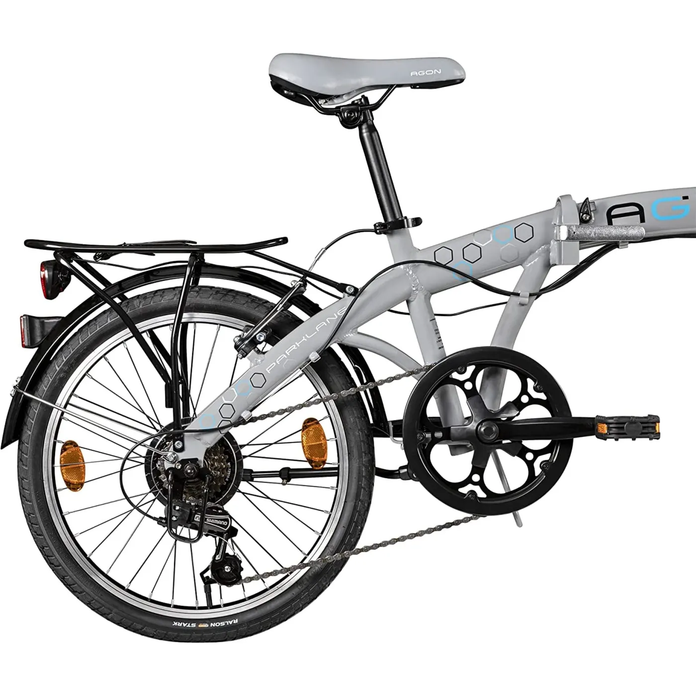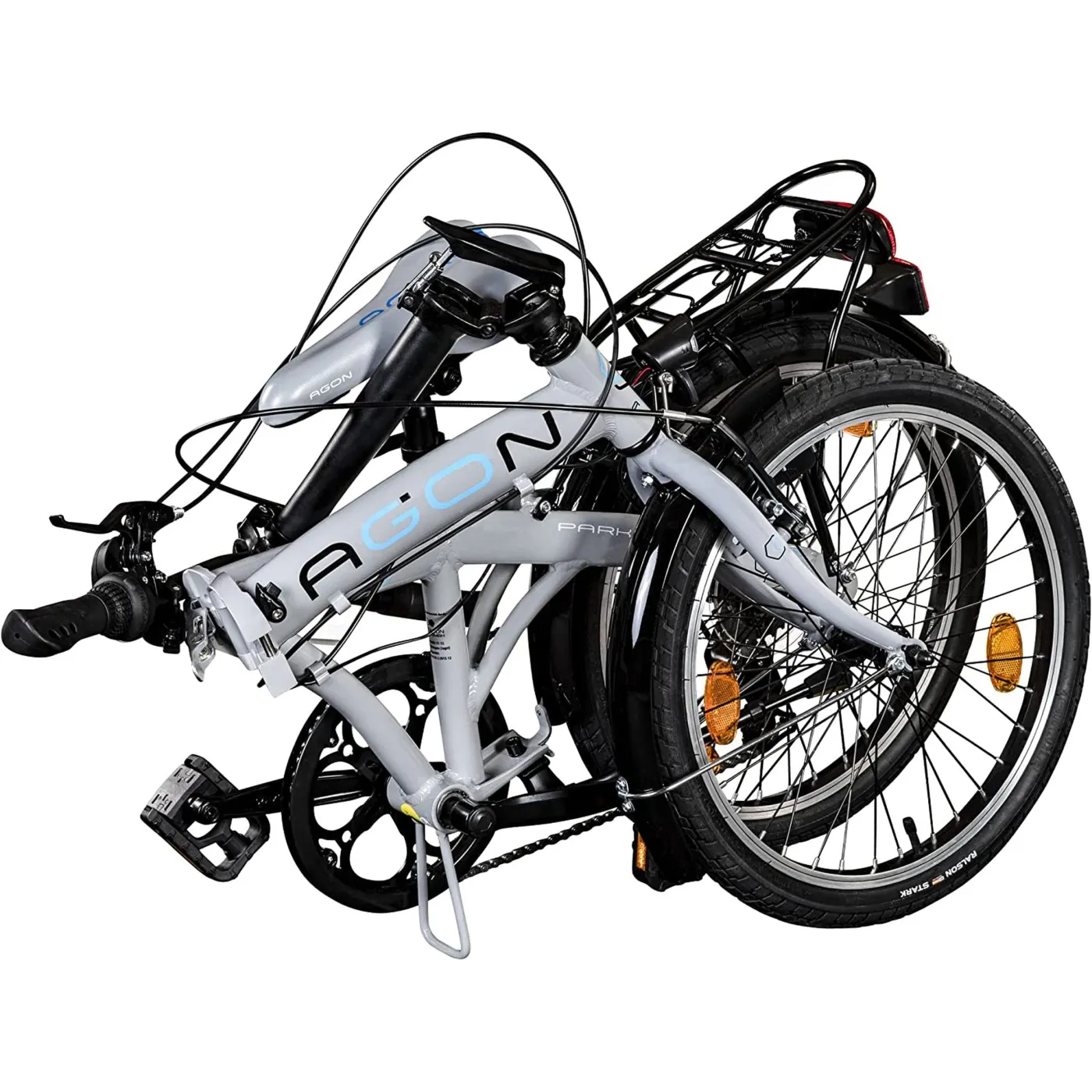 Rower składany Agon Parklane w rozmiarze 20 cali to praktyczny rower miejski, który można złożyć do niewielkich rozmiarów, dzięki czemu można go zabrać ze sobą nawet w transporcie publicznym. Pomimo swojego niewielkiego rozmiaru jazda nie będzie sprawiała żadnych problemów osobom dorosłym. Możesz również z łatwością przechowywać składany rower w samochodzie, zabrać go na kemping lub po prostu użyć go, aby być bardziej elastycznym w mieście. Dzięki 6 biegom użytkownik ma możliwość dopasowania stylu jazdy do panujących na drodze warunków. Hamulce typu V-brake na każdym kole zapewniają bezpieczeństwo podczas hamowania.