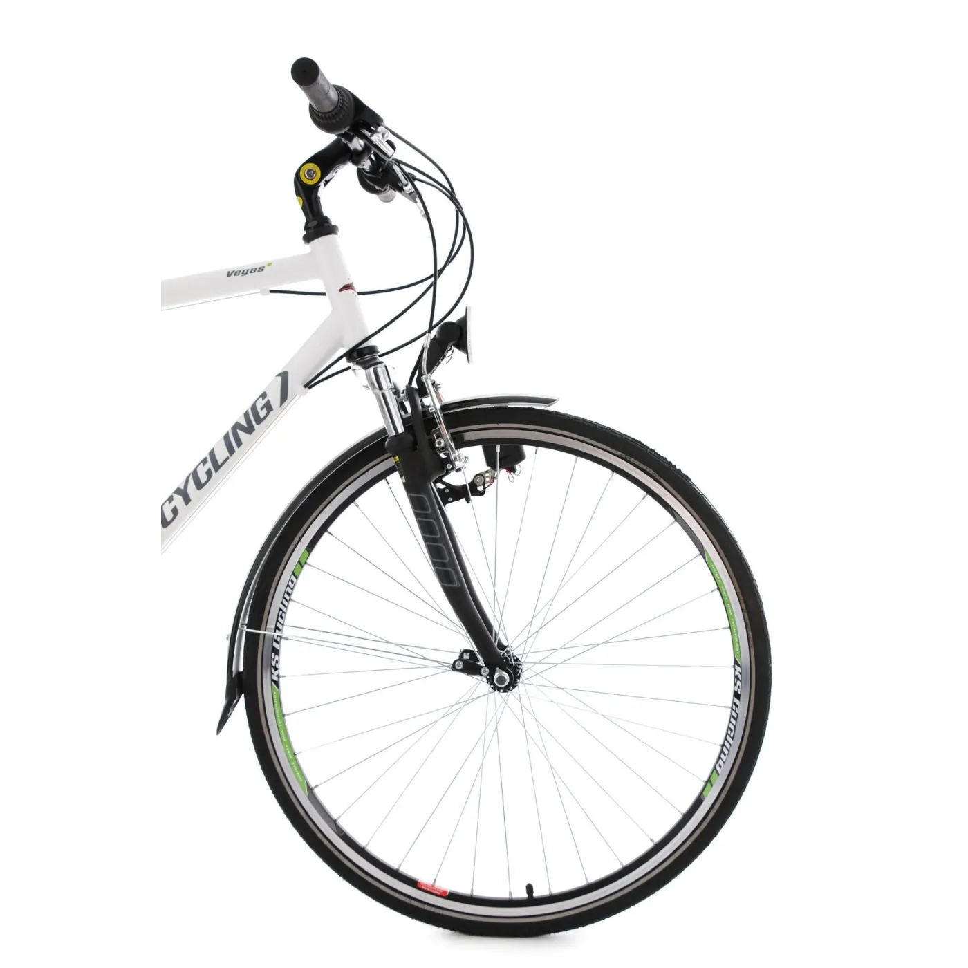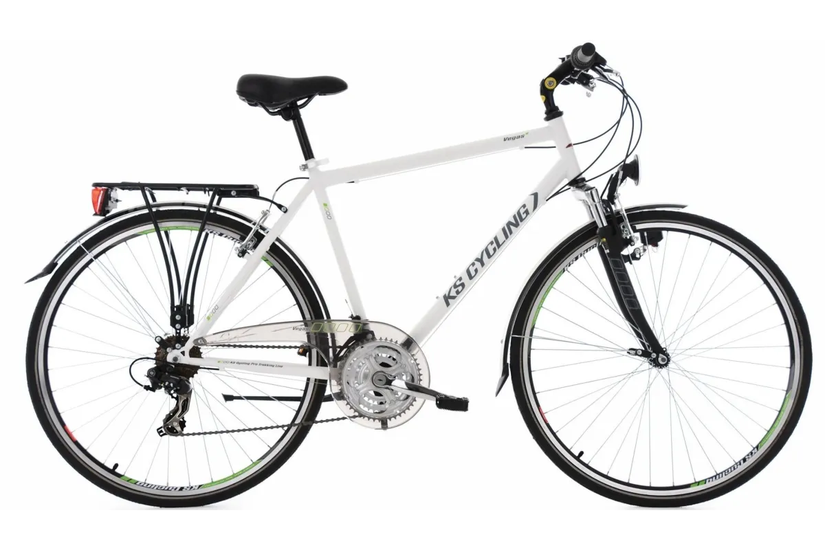 Odkrywaj nowe trasy na rowerze trekkingowym KS Cycling 28" Vegas! Niezależnie od tego, czy chcesz wygodnie jeździć po mieście, czy planujesz dłuższą wycieczkę, sprawdzi się idealnie za każdym razem. Ma białą ramę z eleganckimi detalami. Dzięki 21-biegowej przerzutce pochyłości nie będą stanowić już żadnego problemu.